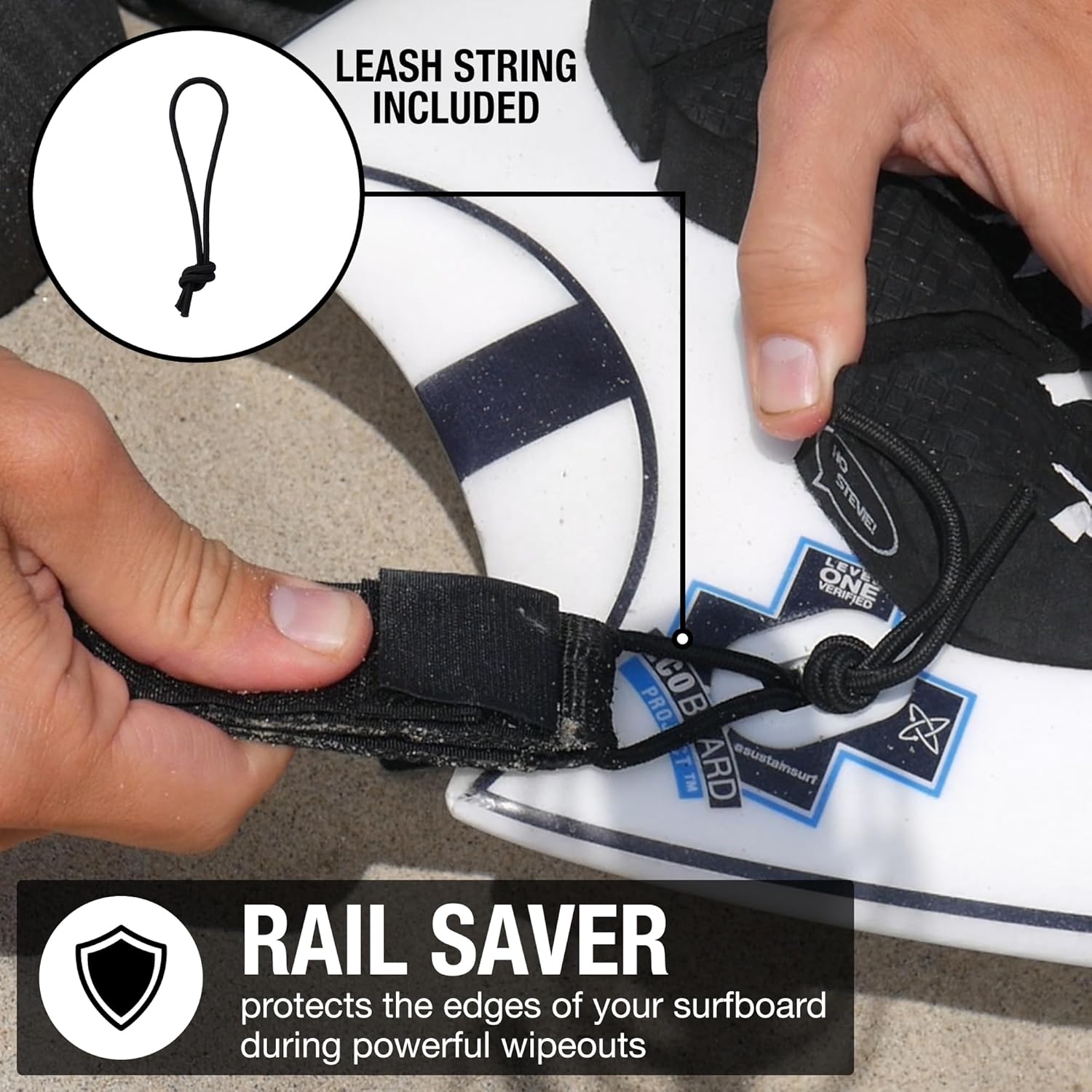 The rail saver connects the leash to your surfboard, and protects the tail of your board from the pressure from your leash during a wipeouts.