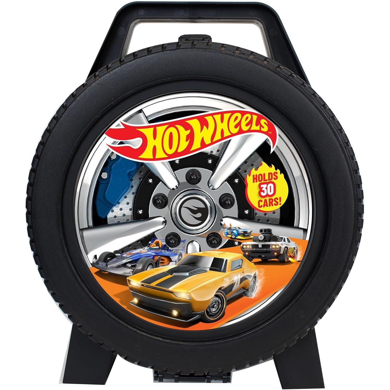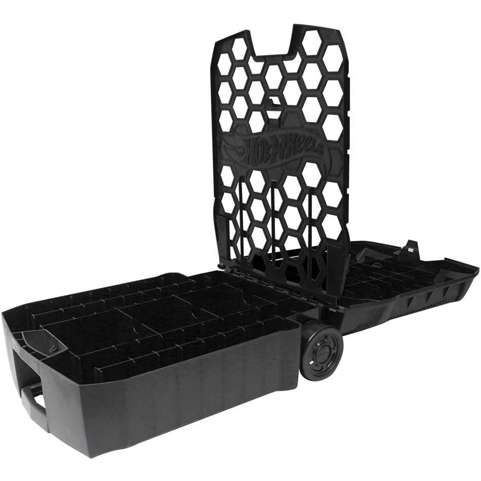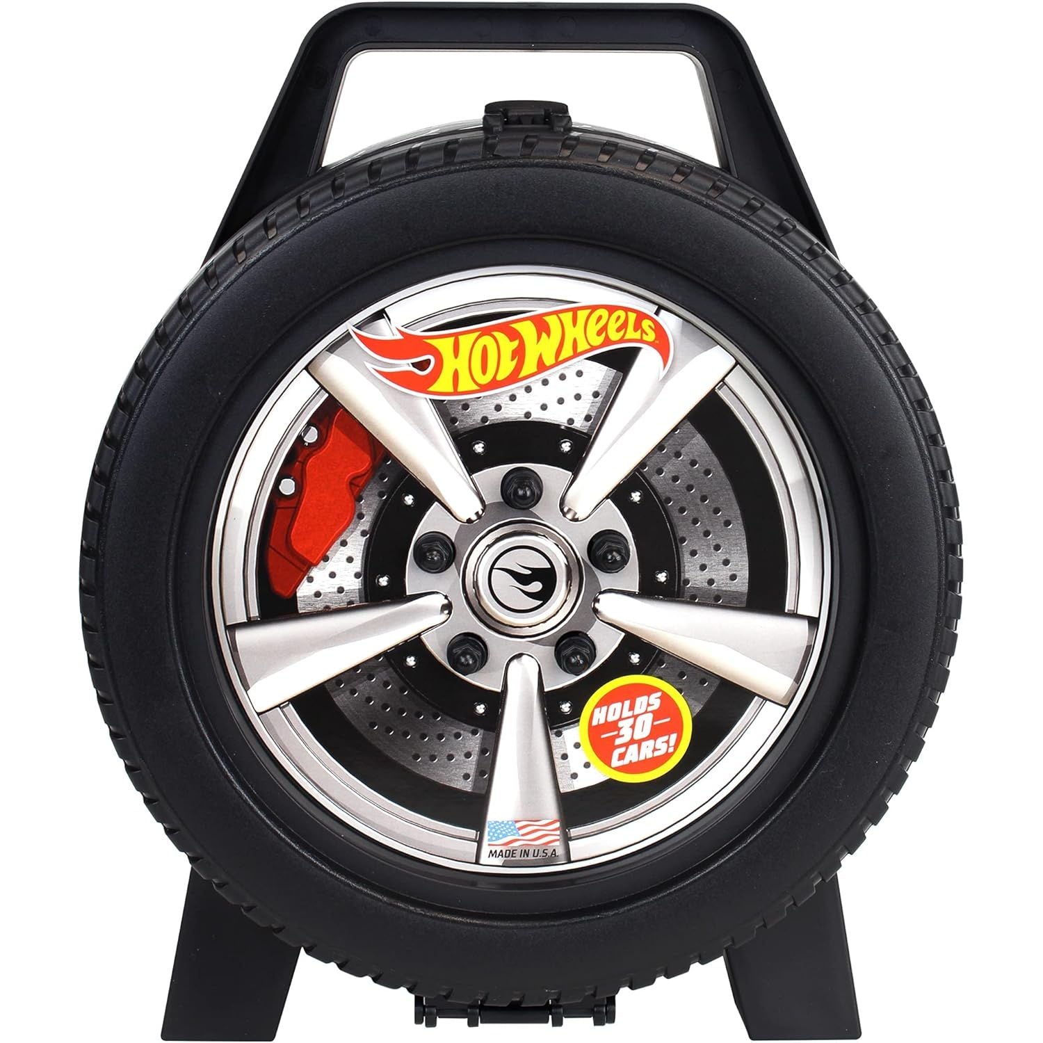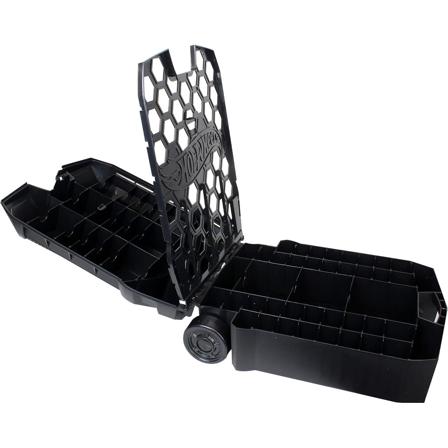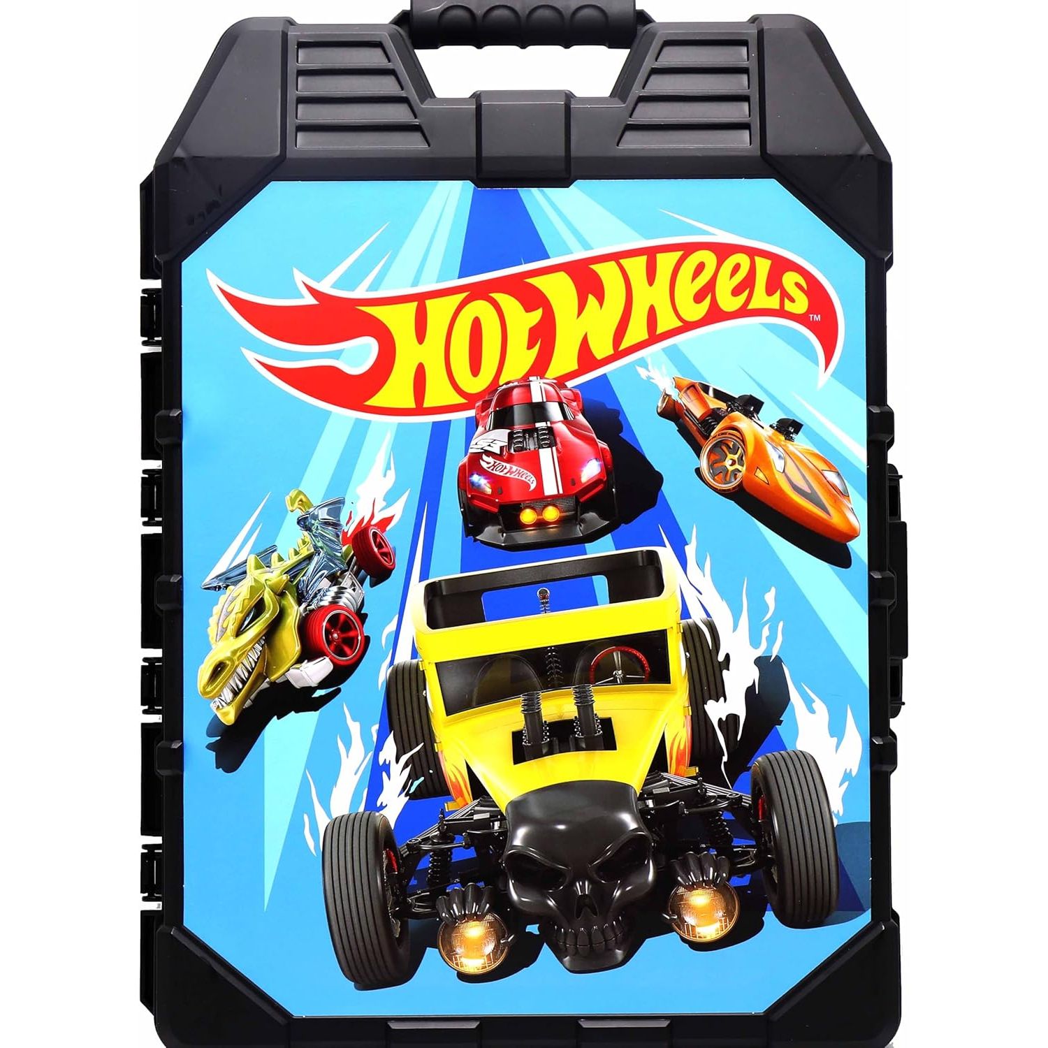 Product Description Collect and store up to 100 1/64th scale Hot Wheels vehicles The rolling wheels and telescoping handle are great for kids on the go! Assorted styles *Hot Wheels cars not included From the Manufacturer This case holds up to 100 1:64th scale Hot Wheel Vehicles. Lift the telescoping handle & wheel the case anywhere.