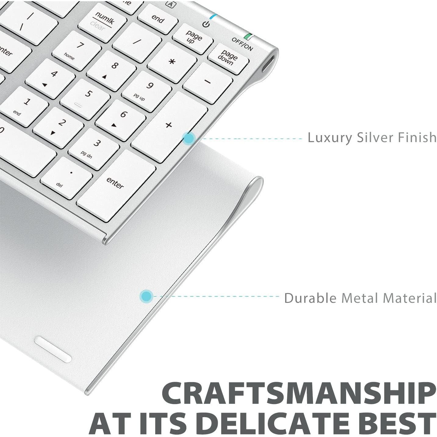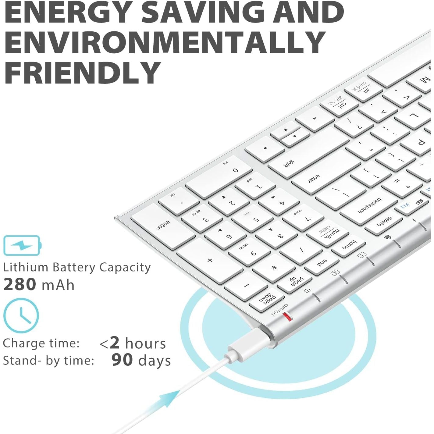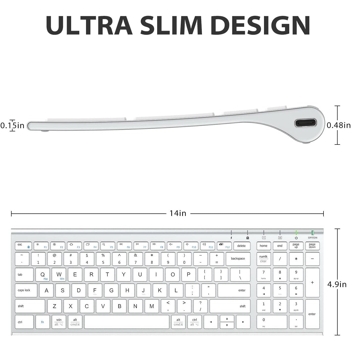 iClever wireless keyboard combines high-end ABS material in the front with gorgeous metal material in the rear, conforming to your pursuit of advanced quality. Built in rechargeable battery.