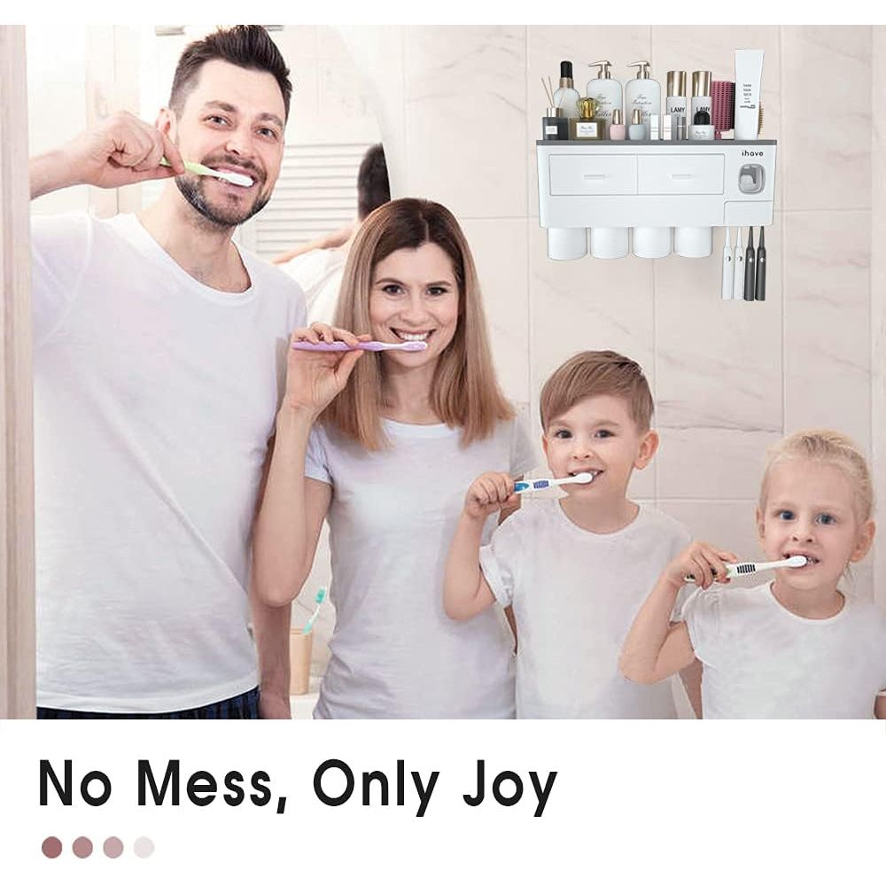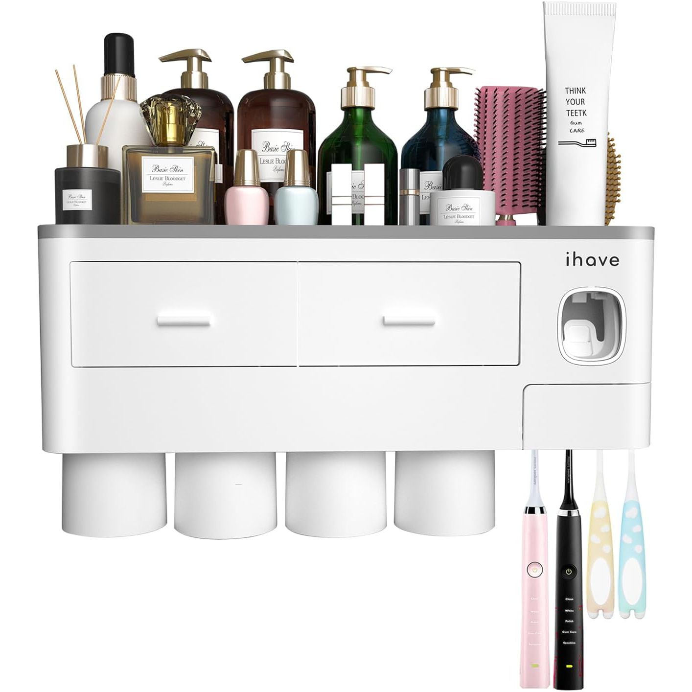 - iHave Toothbrush Holders for Bathrooms, 4 Cups Toothbrush Holder Wall Mounted with Toothpaste Dispenser - Large Capacity Tray, 2 Cosmetic Drawer - Bathroom Organizer & Bathroom Accessories Set