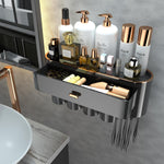 - Multifunction: This multi-function toothbrush holder comes with a automatic toothpaste dispenser, making it easy to squeeze the toothpaste without waste. The 4 magnetic mouthwash cups are designed with an upside-down drain, dust-proof and waterproof. You can hang 7 toothbrushes simultaneously, which is suitable for the whole family.