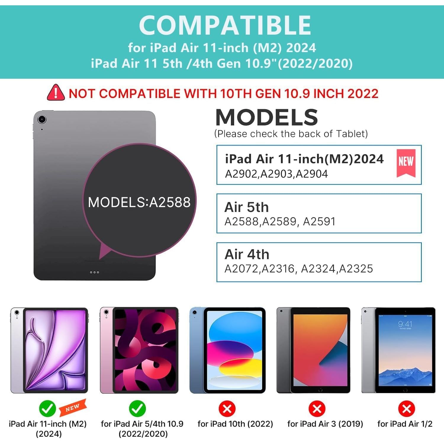 - 🎁【iPad KEYBOARD CASE WIDE COMPATIBILITY】This ipad keyboard case is designed for New iPad Air 11-inch (M2)(Model Number:A2900,A2899),iPad Air 5th Generation 10.9 inch 2022 release(Model Number:A2588/A2589/A2591),iPad Air 4th Generation 10.9 inch 2020 release(Model Number:A2072/A2316/A2324/A2325), iPad Pro 11 Inch 2018 (Model NO:A1980/A2013/A1934/A1979). Please be kindly check your iPad back model before purchasing.Best gift for Valentine's Day, Thanksgiving Day, New Year, Christmas, School Day and wonderful gift for yourself.