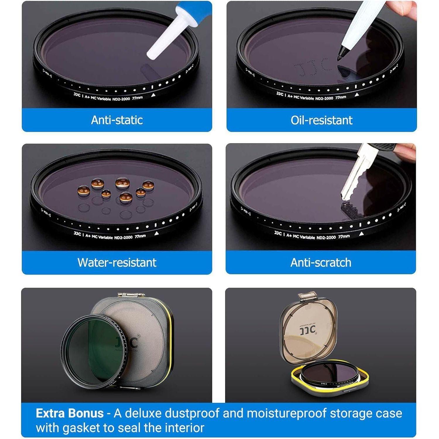 - The filter is constructed from German famous brand optical glass that features 9 layers of anti-reflection coatings on each side(total 18 layers), making the filter anti-scratch, anti-static, oil and water-resistant
