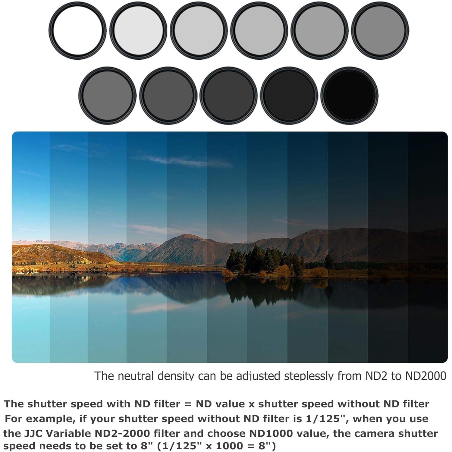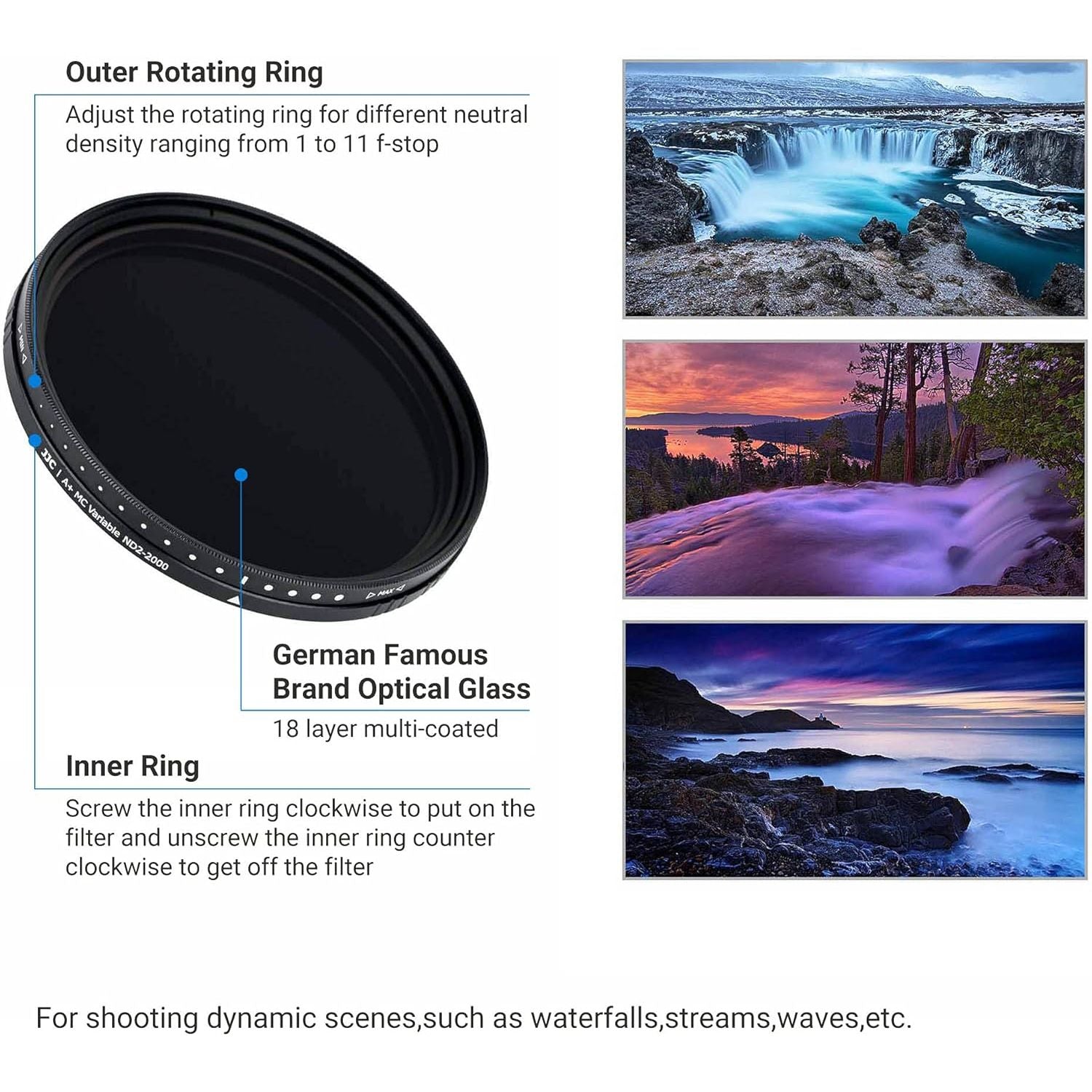 - Eliminates buying many fixed ND Filters as it is designed with a built-in rotating ring that controls neutral density ranging from ND2 to ND2000 (1 to 11 f-stop). The heavier the density, the slower your shutter speed will be