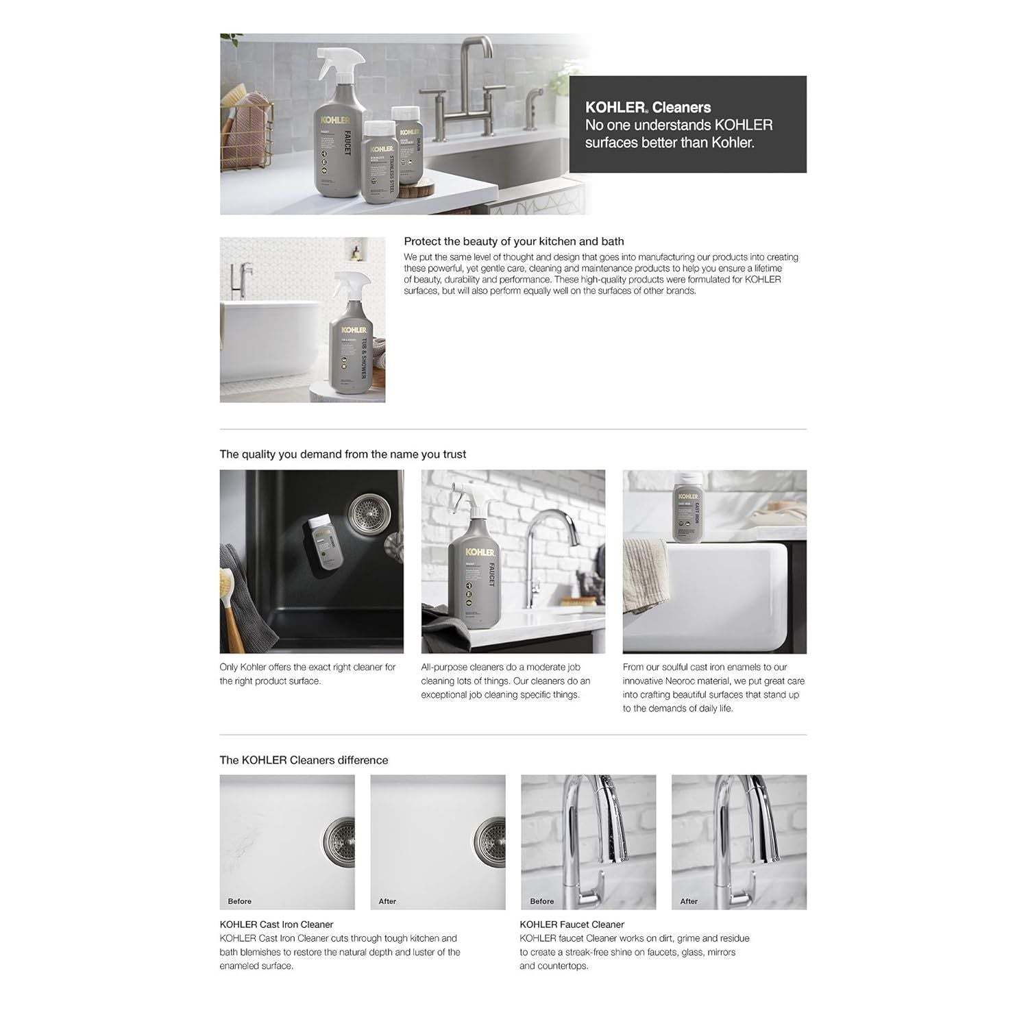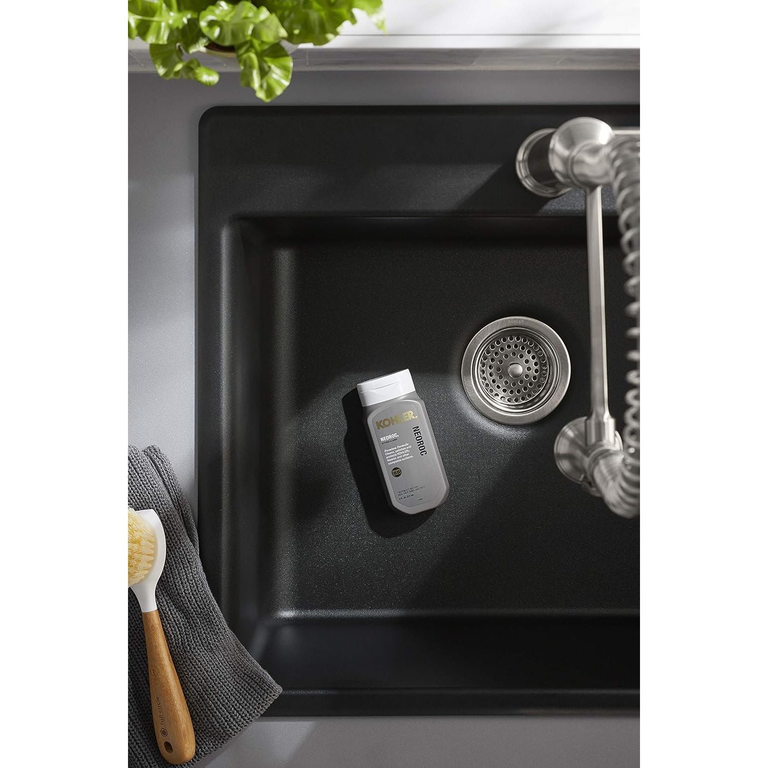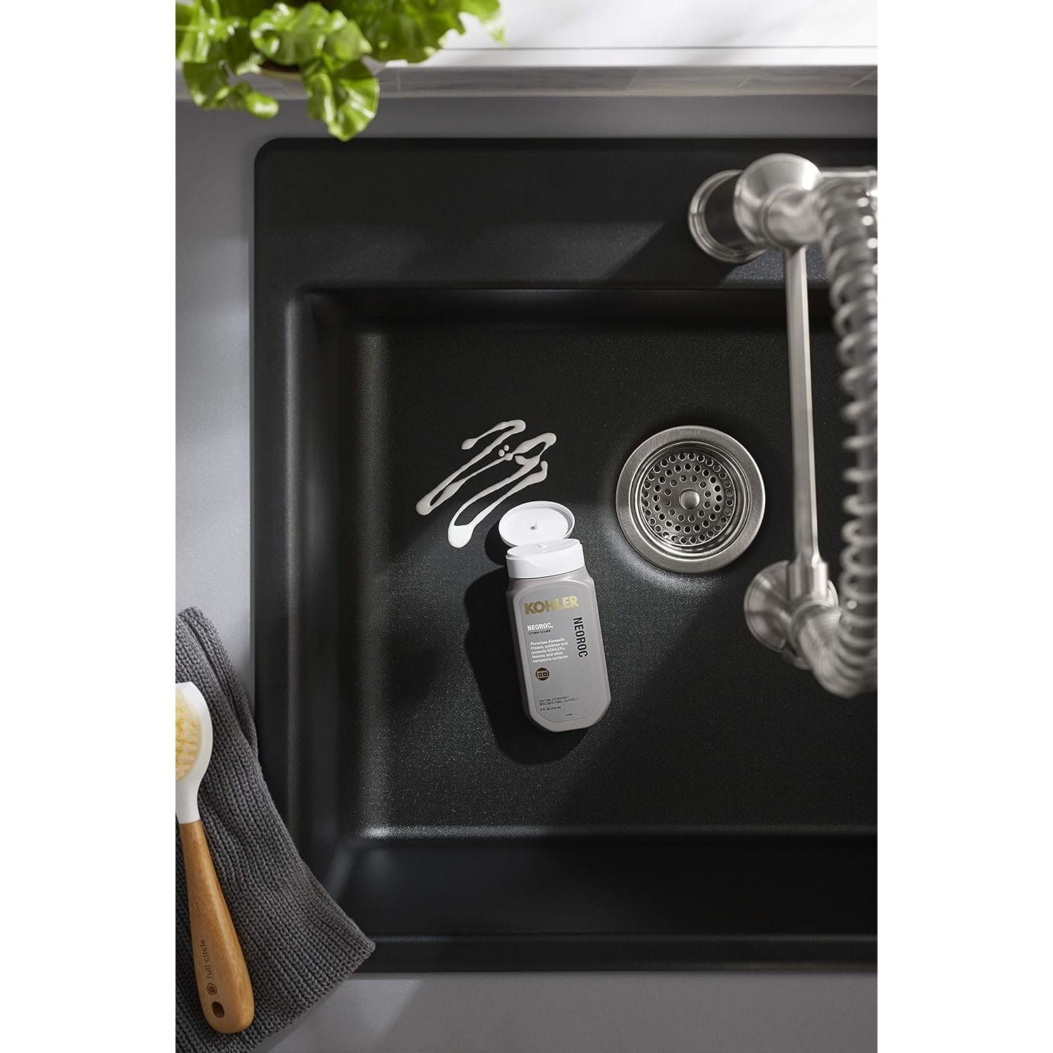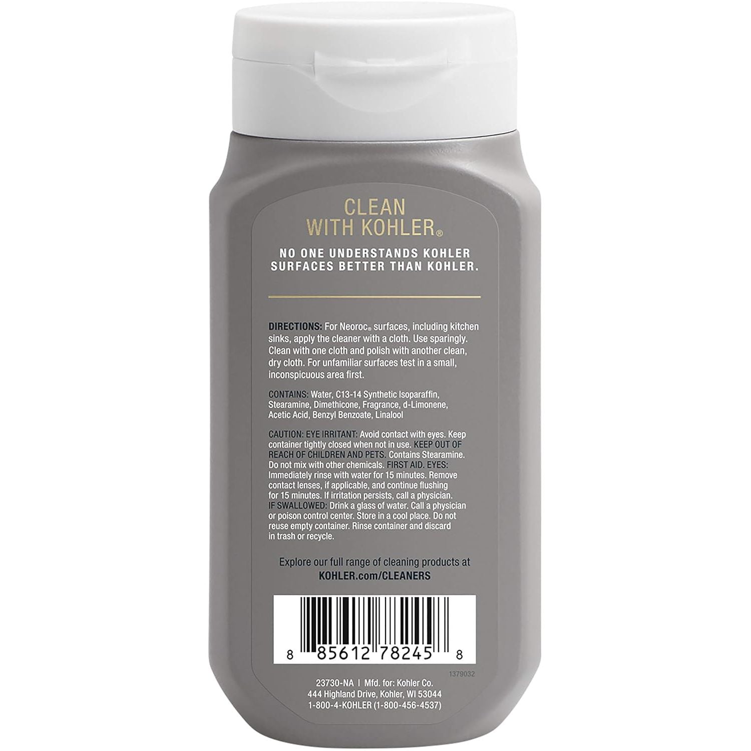 KOHLER premium formula Neoroc cleaner cleans, polishes and protects Neoroc and other composite surfaces.