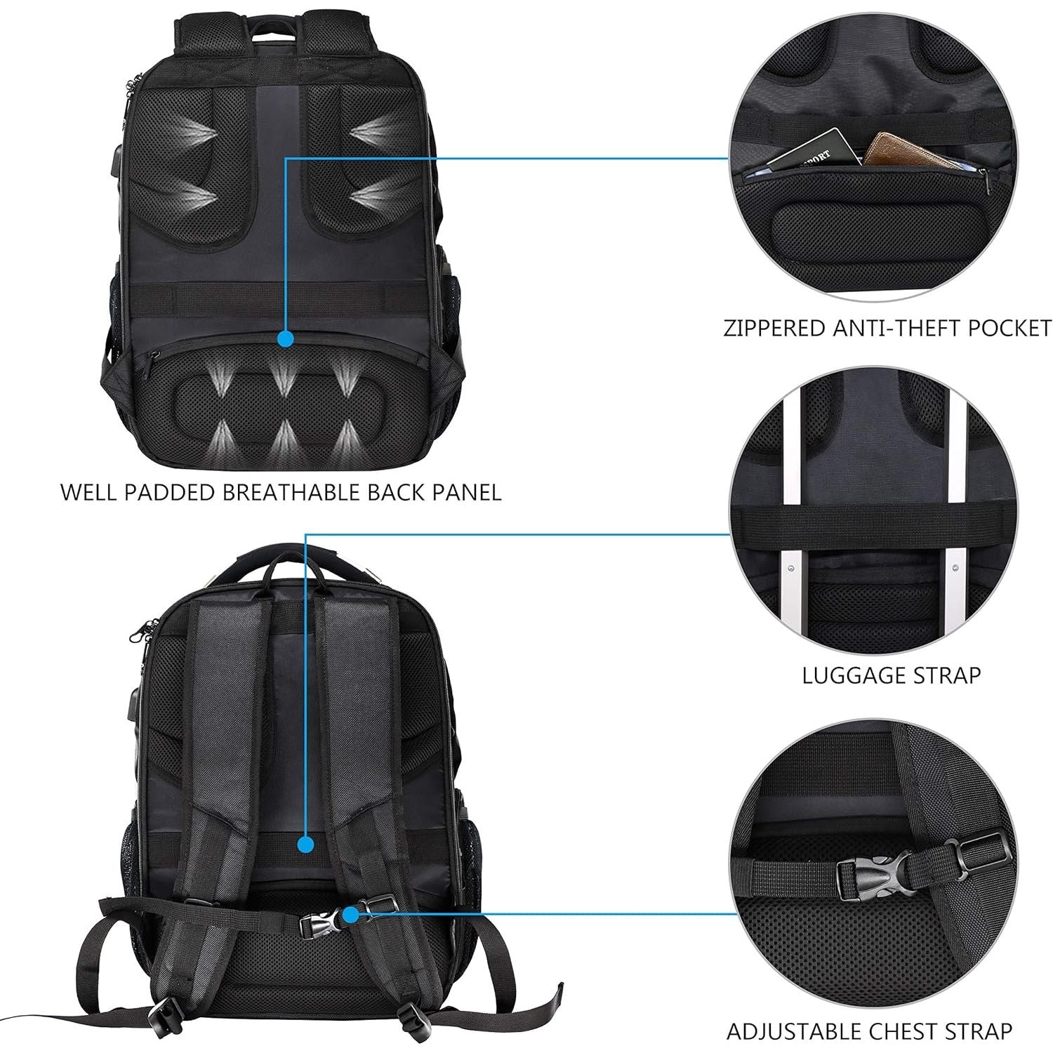 - FUNCTIONAL & SAFETY】:A well-knitted “ luggage strap” is quite convenient for you to fix the backpack on the trolley of your luggage, making your journey and travelling more convenient wherever you go. Design of an air-flow back padding system and a secret pocket ensures great comfort and safety in your journey. RFID Pockets with Identity protection function protects date encoded on most IDs, credit cards and passport