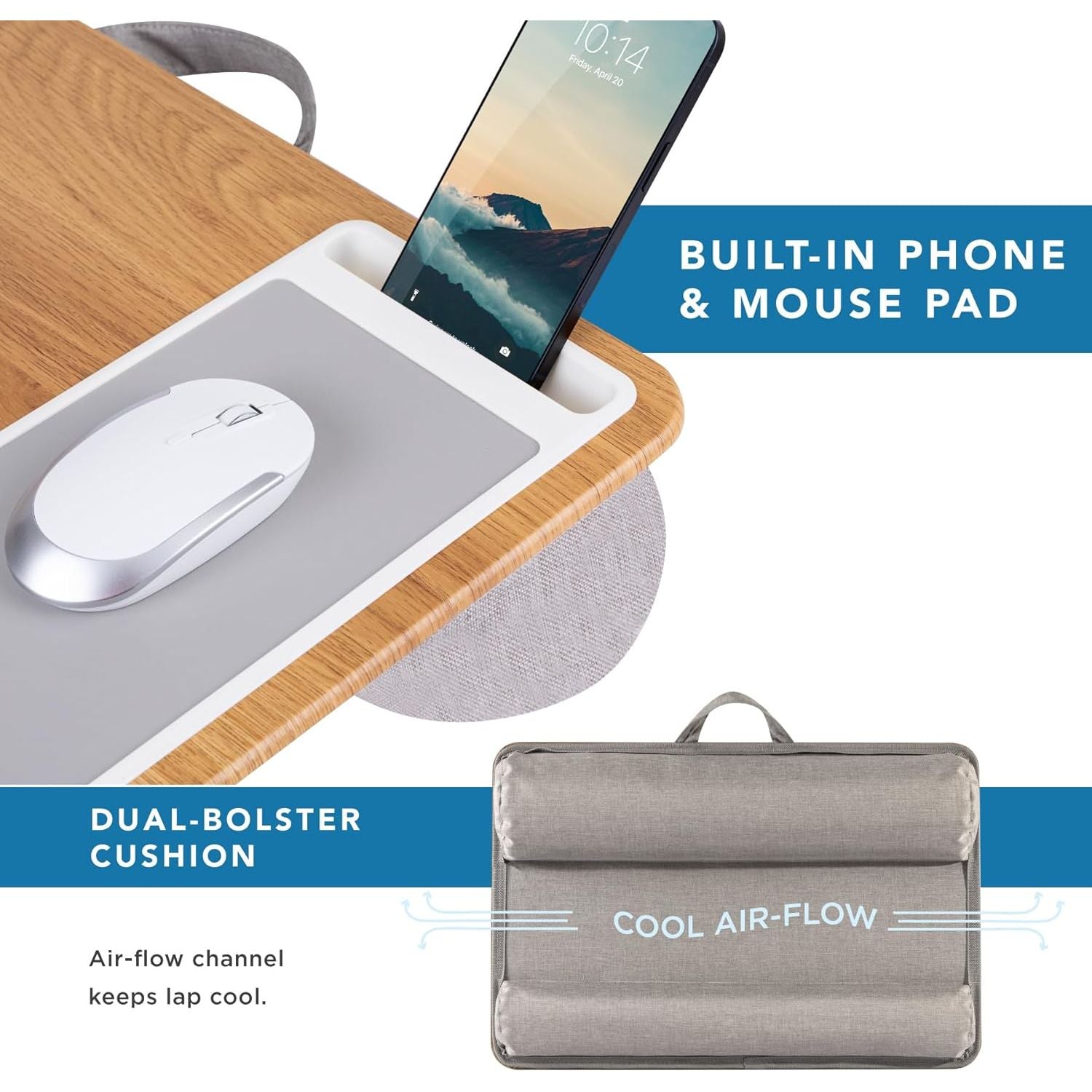 • Cool Comfort: Enjoy a stable surface with our lap desk's dual bolster cushion, designed for comfort and airflow, keeping your lap cool during extended use.