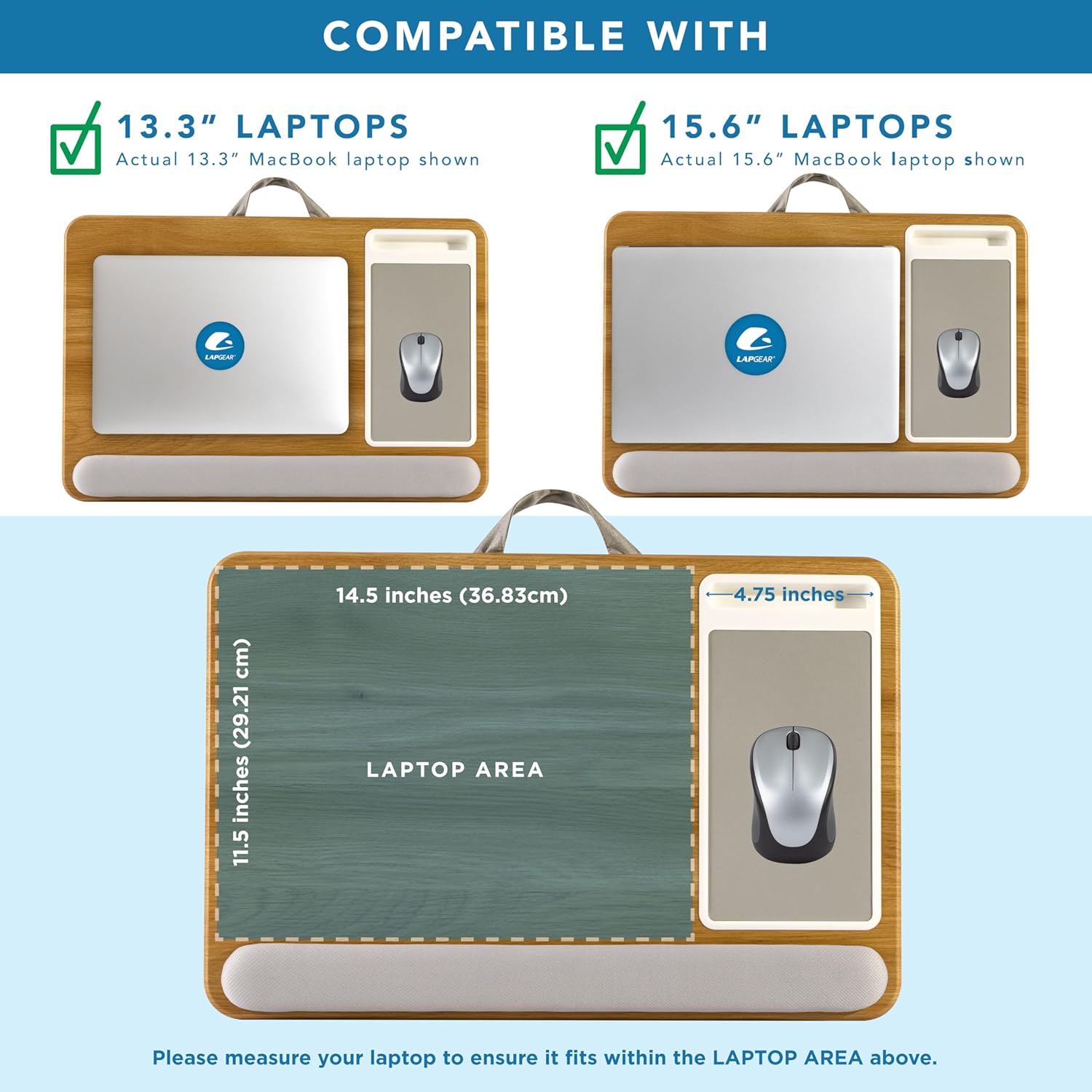 • Spacious Design: Measuring 21.1" wide and 14.1" deep, our lap desk comfortably fits most laptops up to 15.6". Extra room for accessories ensures convenience.