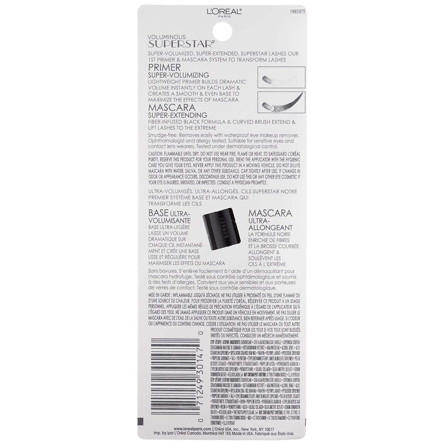 L’Oral Paris Voluminous Superstar Waterproof Mascara is a two-step primer and lengthening mascara for a show-stopping lash effect. Super-volumizing primer builds dramatic volume on every lash and creates an ultra smooth base to maximize mascara performance. Super-extending mascara with a fiber-rich black formula. • Super-volumized, Super-extended lashes • Primer and Fiber Mascara System • Superstar Lashes • Smudge proof, Waterproof mascara Start by applying the Super-Volumizing primer making sure to coat every lash. Then, before the primer dries apply the fiber-rich mascara on top of the primed lashes to create a show-stopping lash look. Repeat on other eye. Flammable until dry. Do not use near fire, flame or heat. To safeguard L’Oral purity, reserve this product for your personal use. Treat the applicator with the hygienic care you give your eyes. Never apply this product in a moving vehicle. Do not dilute mascara with water, saliva, or any other substance. Cap tightly after use. If change in odor or appearance occurs, discontinue use. Do not use this or any other eye cosmetic if your eye is injured, irritated or infected. Consult a physician.