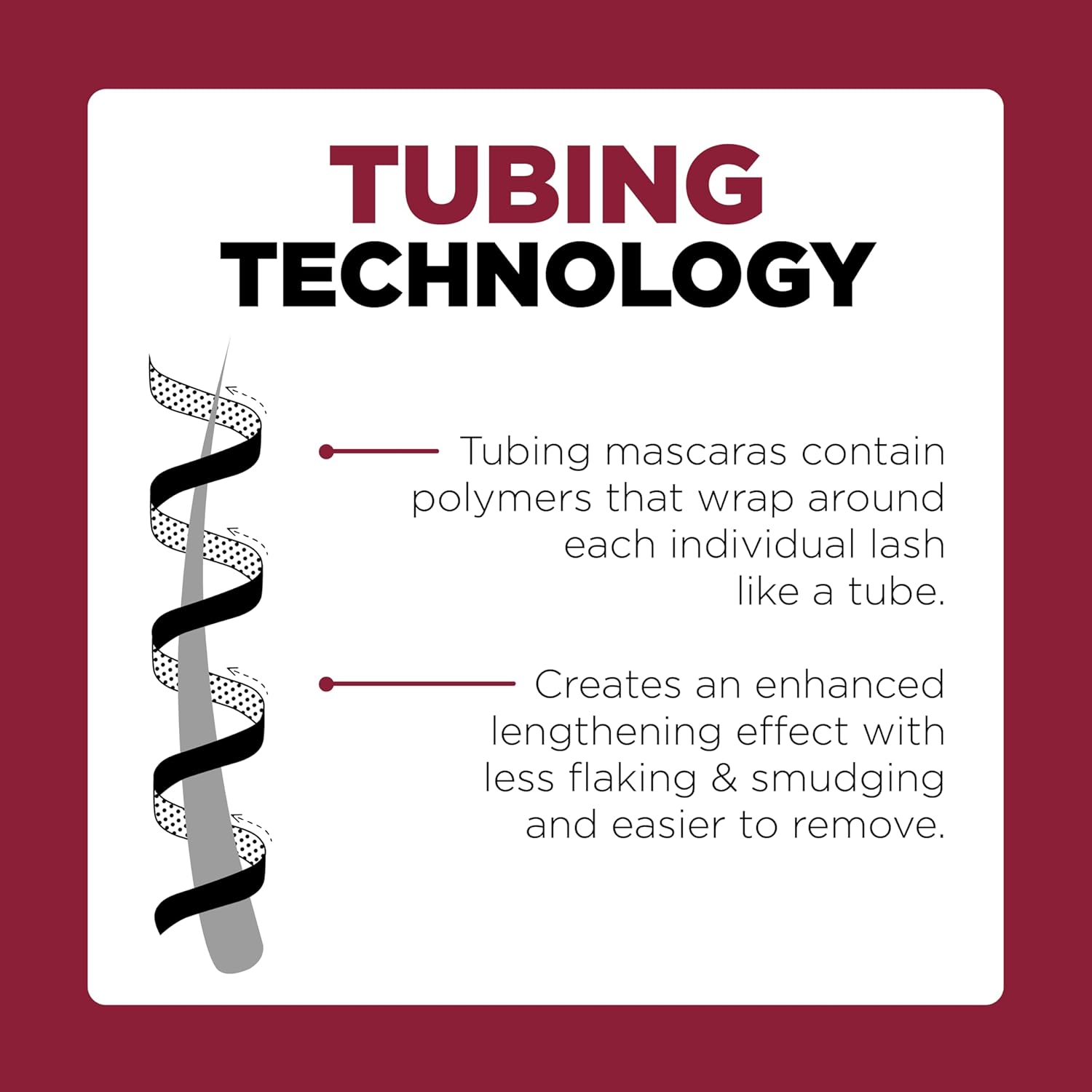 • L'Oreal Tubing Technology: Tubing mascaras contain polymers that wrap around each individual lash like a tube that creates an enhanced lengthening effect with less flaking and smudging and easier to remove.