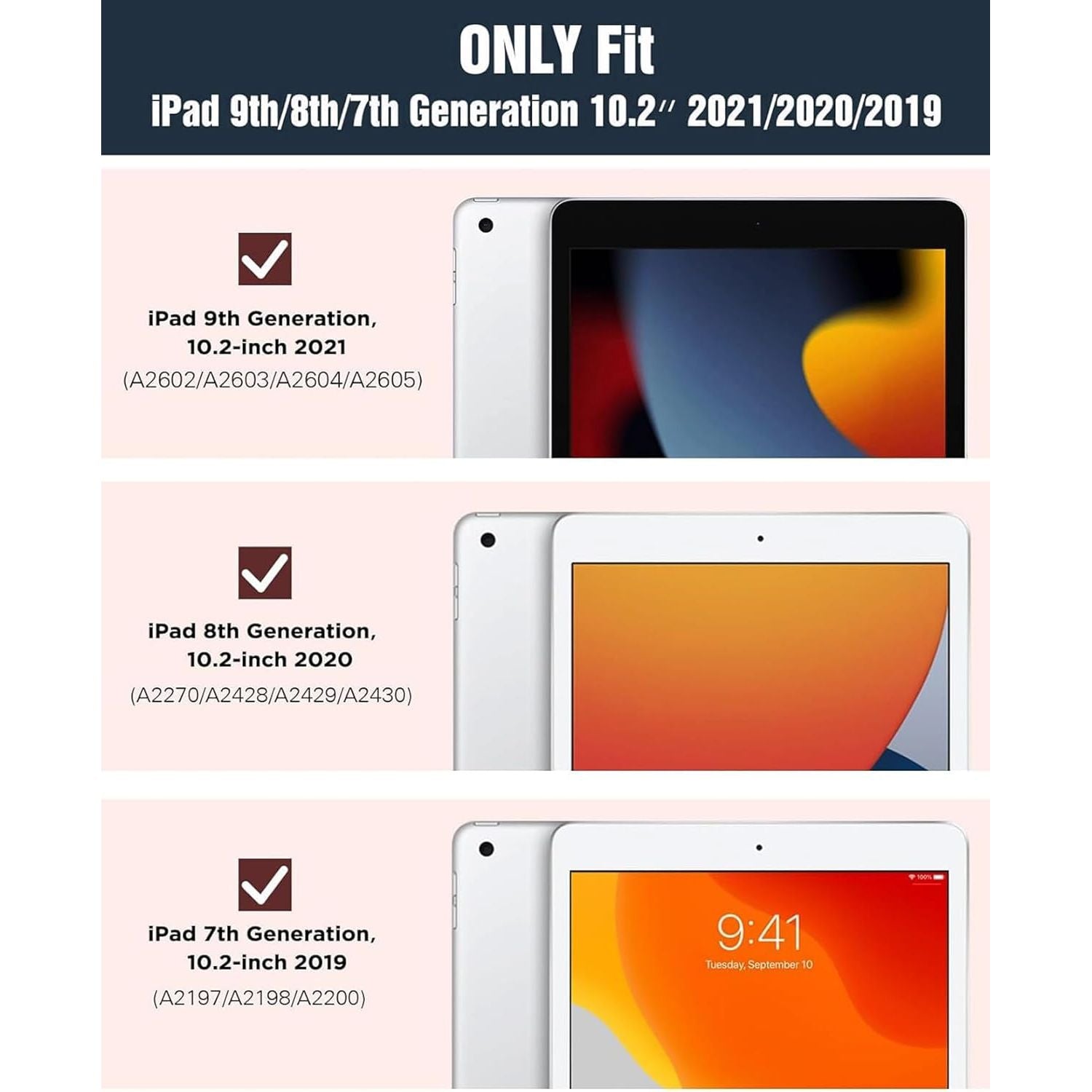 - FIT MODEL - iPad 10.2 case 2021/2020/2019, fit to New iPad 9th Generation 2021 release 10.2-inch (Latest Model: A2602, A2603, A2604, A2605), iPad 10.2 8th Generation 2020 (Model: A2428, A2429, A2430, A2270), and iPad 10.2 7th Generation 2019 (Model: A2197, A2200, A2198)