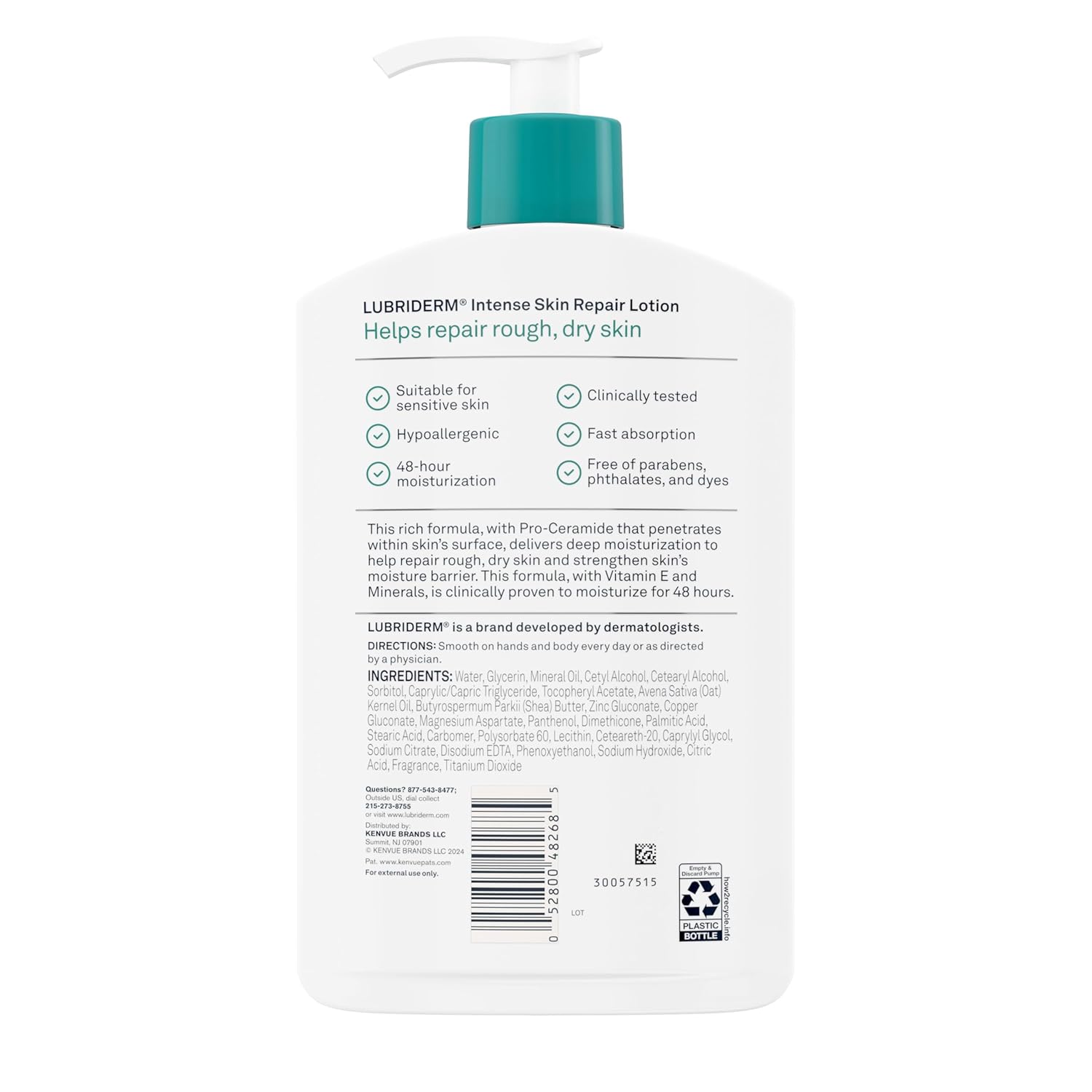 Intensely moisturize rough, extra-dry skin with Lubriderm Intense Skin Repair Daily Moisturizing Lotion + Pro-Ceramide. From a dermatologist-developed brand, this moisturizing body and hand lotion for sensitive skin is clinically shown to help moisturize for 48 hours, and penetrate within skin's surface to deliver deep moisturization to help repair rough, dry skin. Formulated with Vitamin E and Pro-Vitamin B5 plus Pro-Ceramides, this lightly scented hand and body lotion replenishes and helps strengthen your skin's moisture barrier. Plus, its fast-absorbing formula is non-greasy with a clean, comfortable feel. The clinically and dermatologist tested hypoallergenic ultra-moisturizing lotion is formulated free of parabens, phthalates, and dyes. Smooth the non-greasy lotion on hands and body every day or as directed by a physician to hydrate to help repair your rough, dry skin.