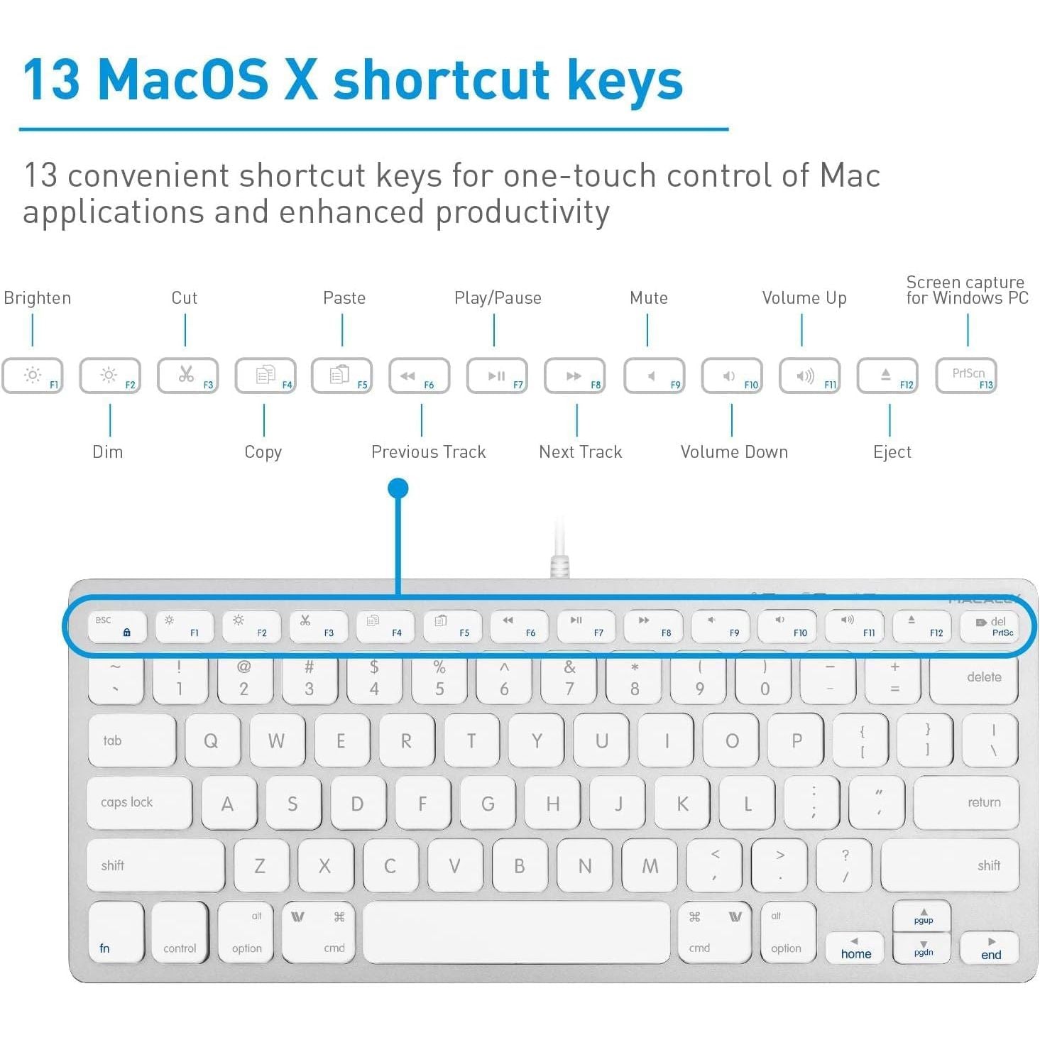 - One Touch Shorcut Keys: With 13 shortcut keys like (cut/copy/paste/iTunes/etc.) for Mac and multimedia hotkeys for Windows, you will be able to effortlessly control your typing experience with the mac USB keyboard.