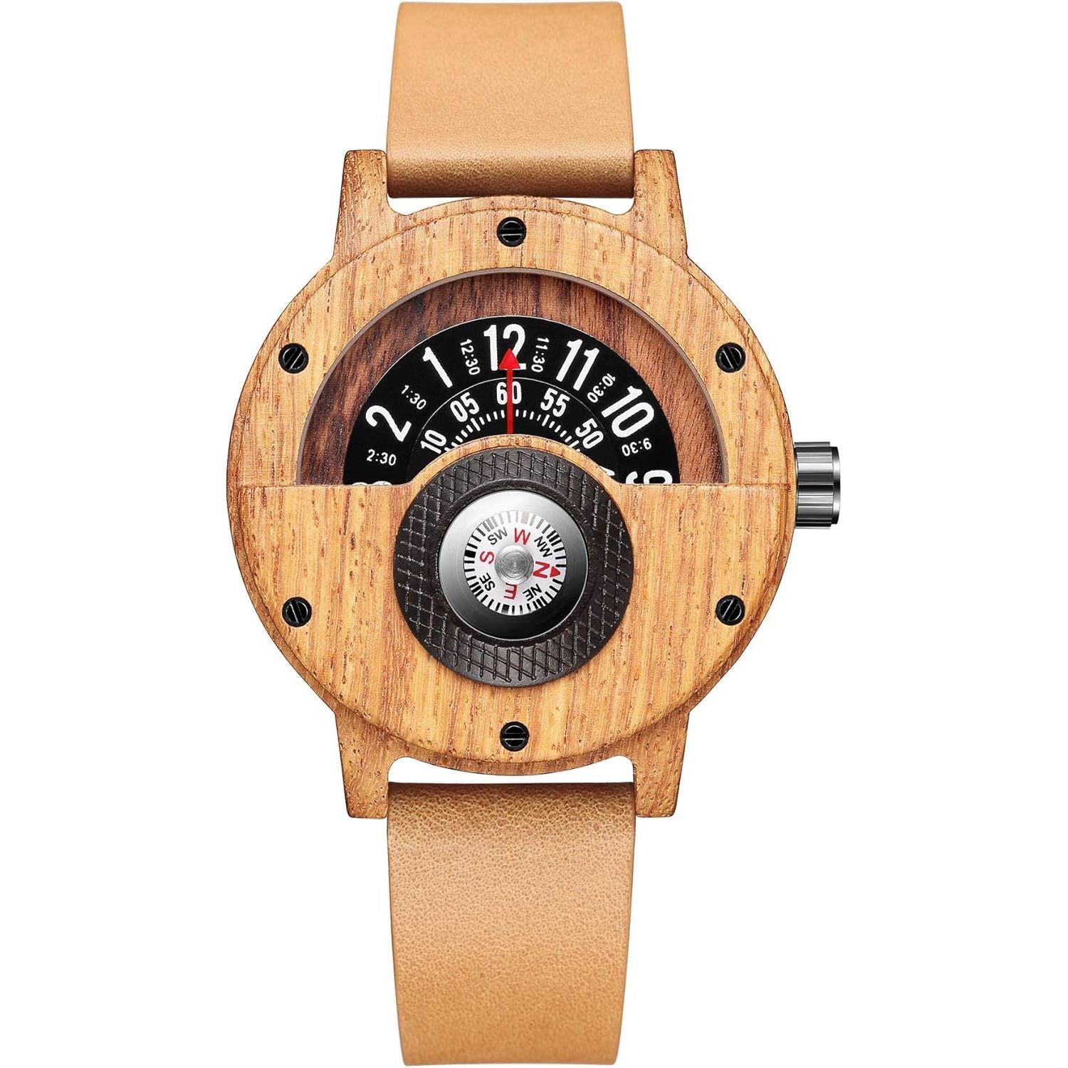 Men's Handmade Wooden Watches Mens Lightweight Analog Quartz Wood Mens Wrist Watch with Compass