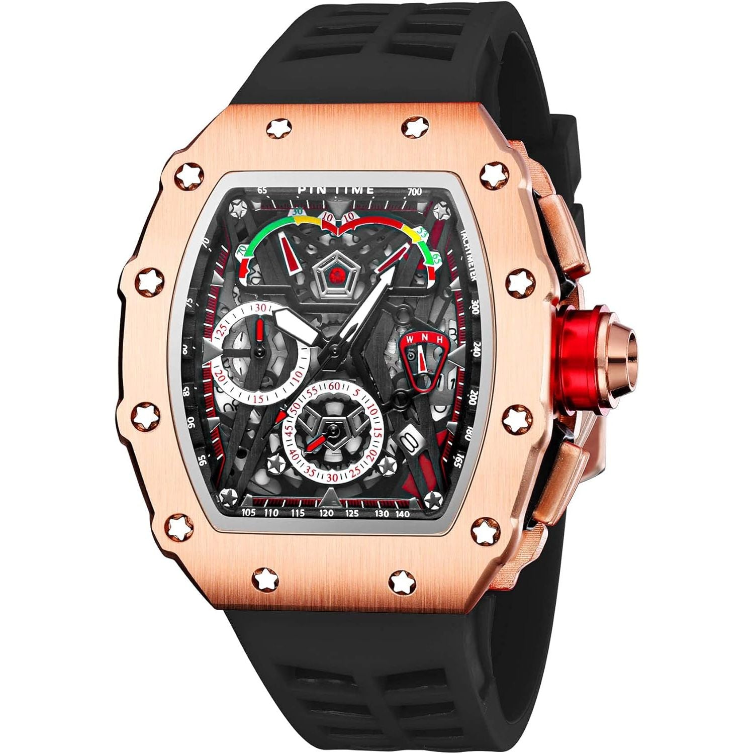 Features Chronograph watch Big face mens fashion watch Mens skeleton watch Stars decored bezel Luminous pointer east read watch Curved hardlex crystal protects watch from scratches Very fashion for all occasion , best gift for men Absolutely a stunning watch, very hot and works well. Unique dial and stars decored bezel on the edge made it a different and shiny look, have got many compliments when you wear the watch. It could be regarded as very special gifts to send your family, houband, friends, colleagues, etc. Fashion watches could also be popular for birthday, father's day, Christmas, new year and valentine day and so on. Product Description Classic tonneau watch with fashion element Ion-plated black/rose gold case Sporty style chronograph watch with 3 small subdials Tooth wheel and stars partterns on the dial Big arc watch case, thick and solid Soft and comfortable rubber strap(black/red/yellow optional) Specification Case Size (H x W): 1.77"(4.5cm) x 2.16"(5.5cm) Dail Case Thickness: 0.7"(1.8cm) Watch Strap Length: 9.05"(23cm) Band Width: 1.00"(2.5cm) Item Weight: 135g Dial Window: Mineral Glass Band Type: Rubber Gender: Men/Male Watch Style: Dress;Business;Casual;Sports Package Include 1 * Watch 1 * Gift Box