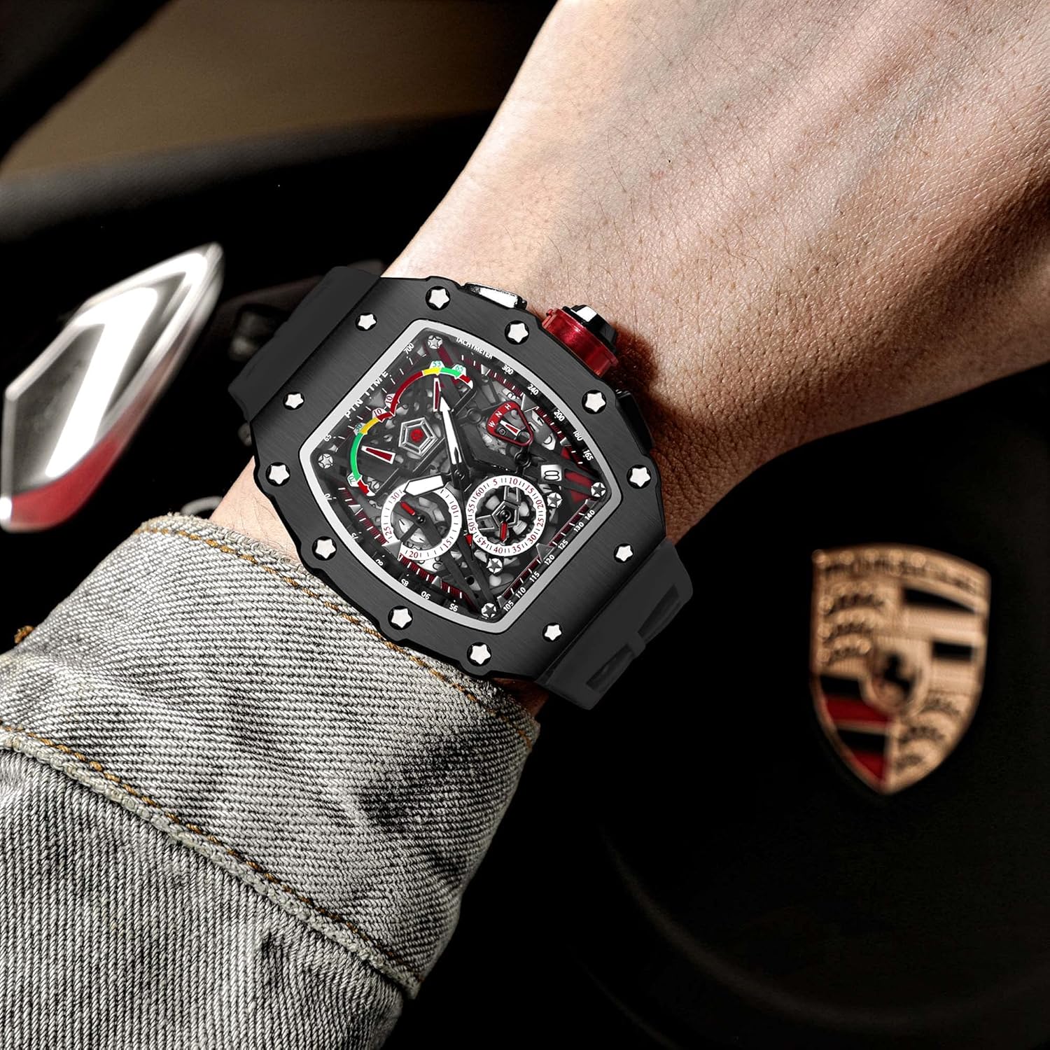 • ★Mens Skeleton Watches: The barrel-shaped design of the watch is based on the arc geometry that fits the very best, and is more comfortable when used. The skeleton dial allowing you to see the exquisite design inside the watch-craftsmanship directly. The crown resembles the wheel of a sports car.