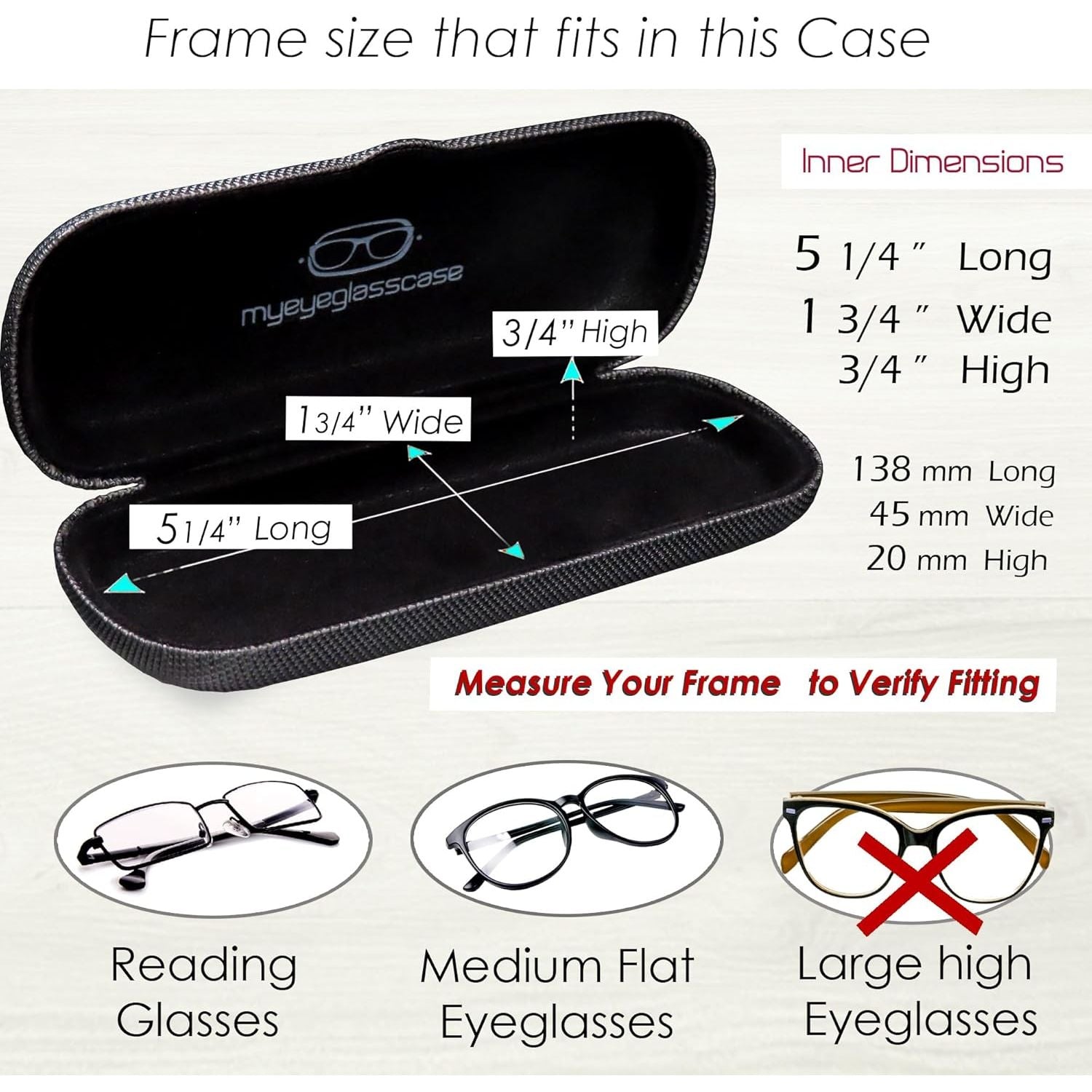 - UNIVERSAL SIZE FIT: No more worries about finding the right glasses case for your eyewear. The My Eyeglass Case is meticulously designed to accommodate a variety of frames, ensuring a snug fit for sunglasses up to 5 1/4" L x 1 3/4" W x 3/4" H. Whether they're big aviators or small reading glasses, they'll find a home here.