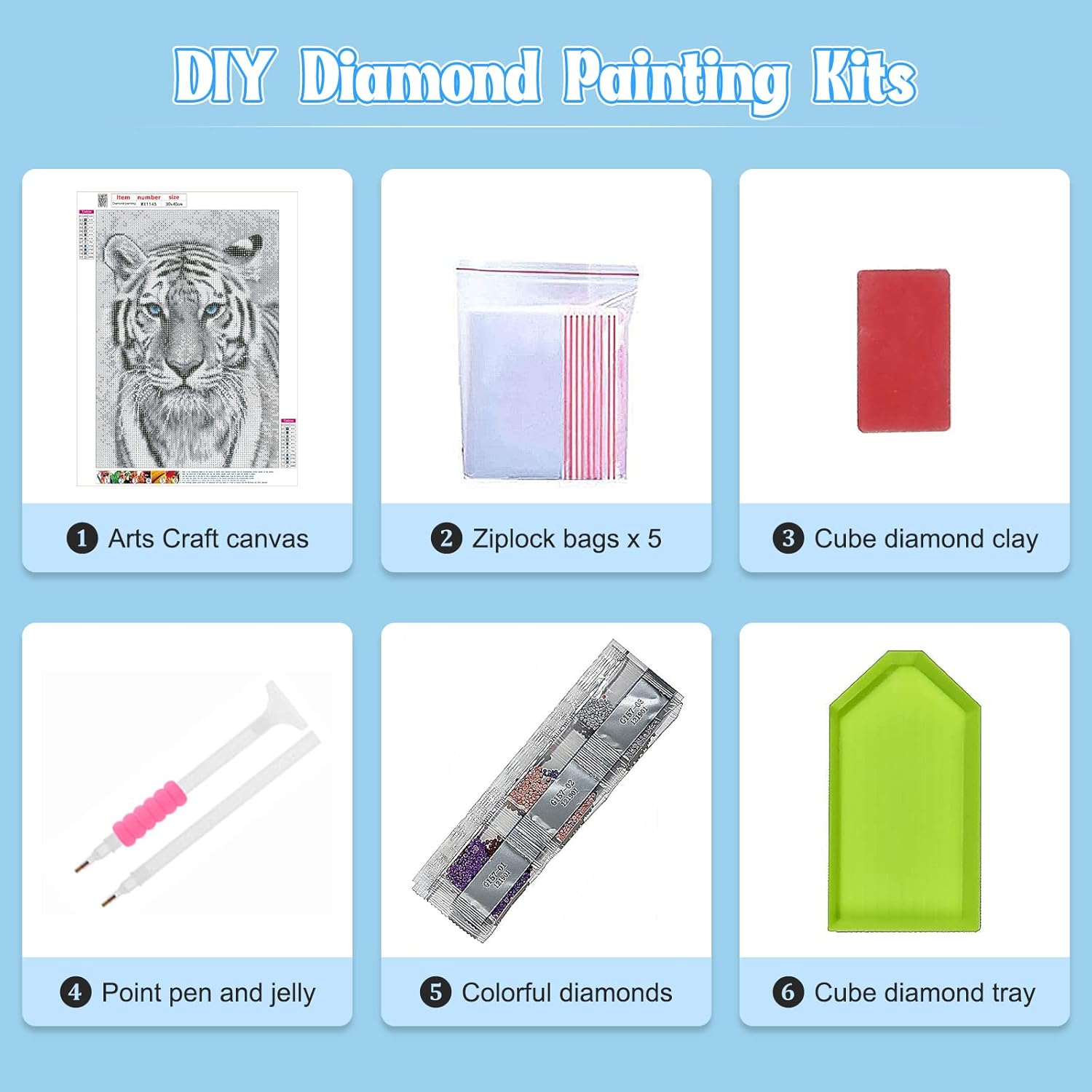 | included components | Colorful round diamonds, Cube clay, Cube diamond tray, Diamond bag, Diamond pen, High definition oil canvas |