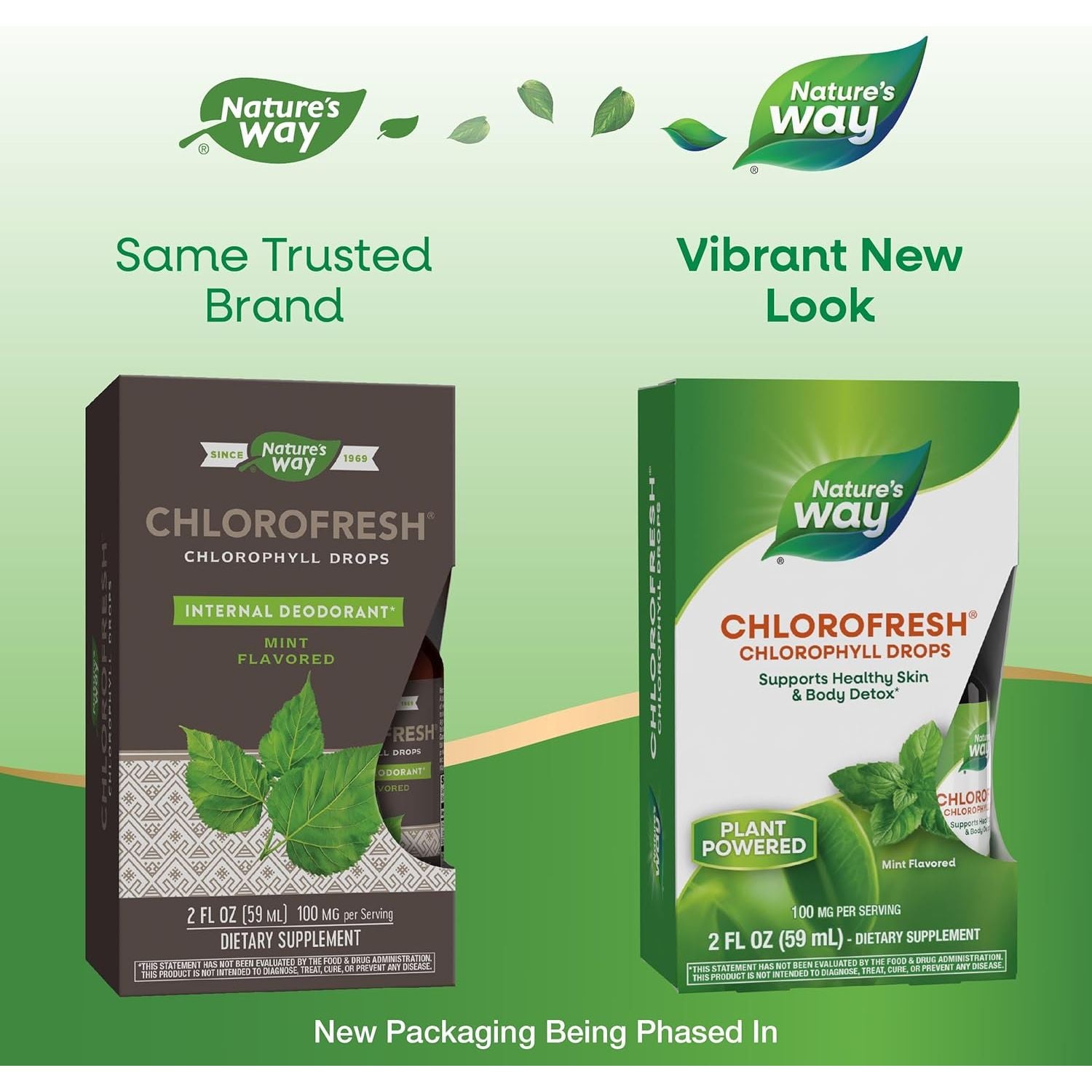- Nature's Way Chlorofresh, Liquid Chlorophyll Concentrate Drops, Internal Deodorant*, Supports Detoxification Pathways*, Mint Flavored, 2 Fl. Oz.