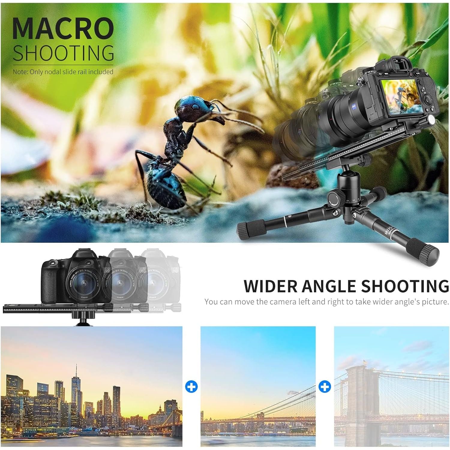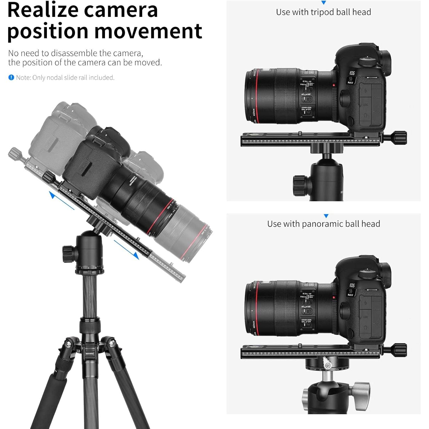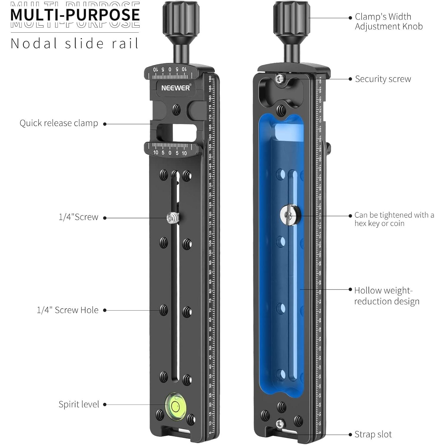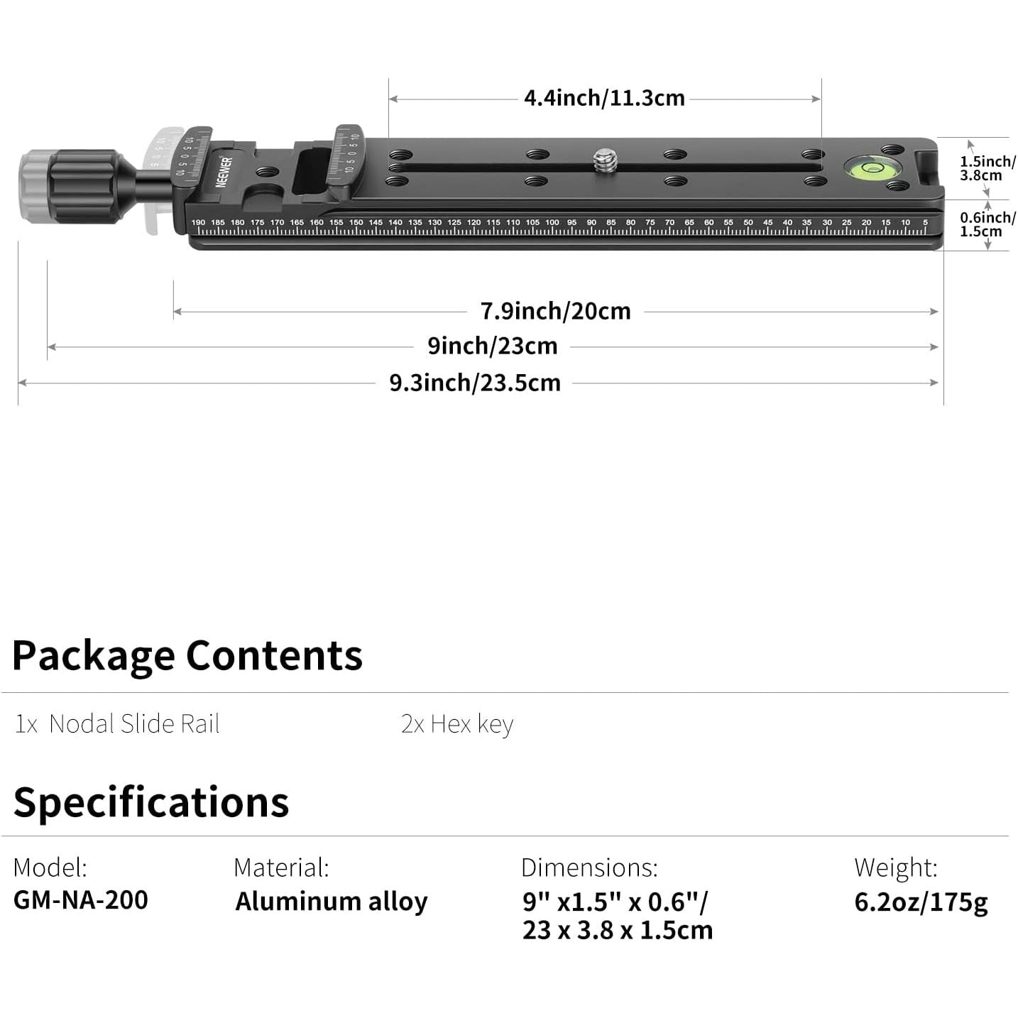 - Multi-purpose rail nodal slide with Arca standard screw-knob clamp, precision laser engraved scale and spirit level, excellent for panoramic and close-up photography