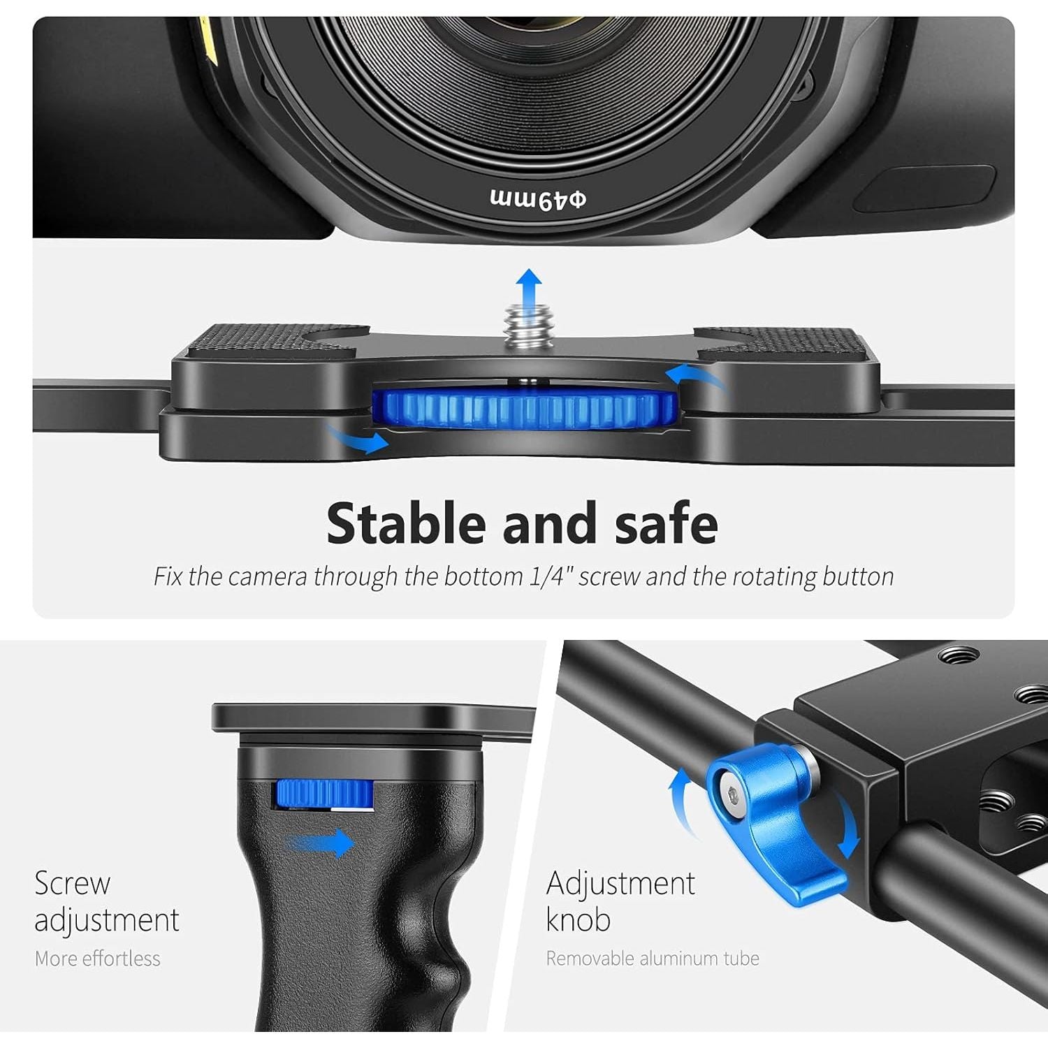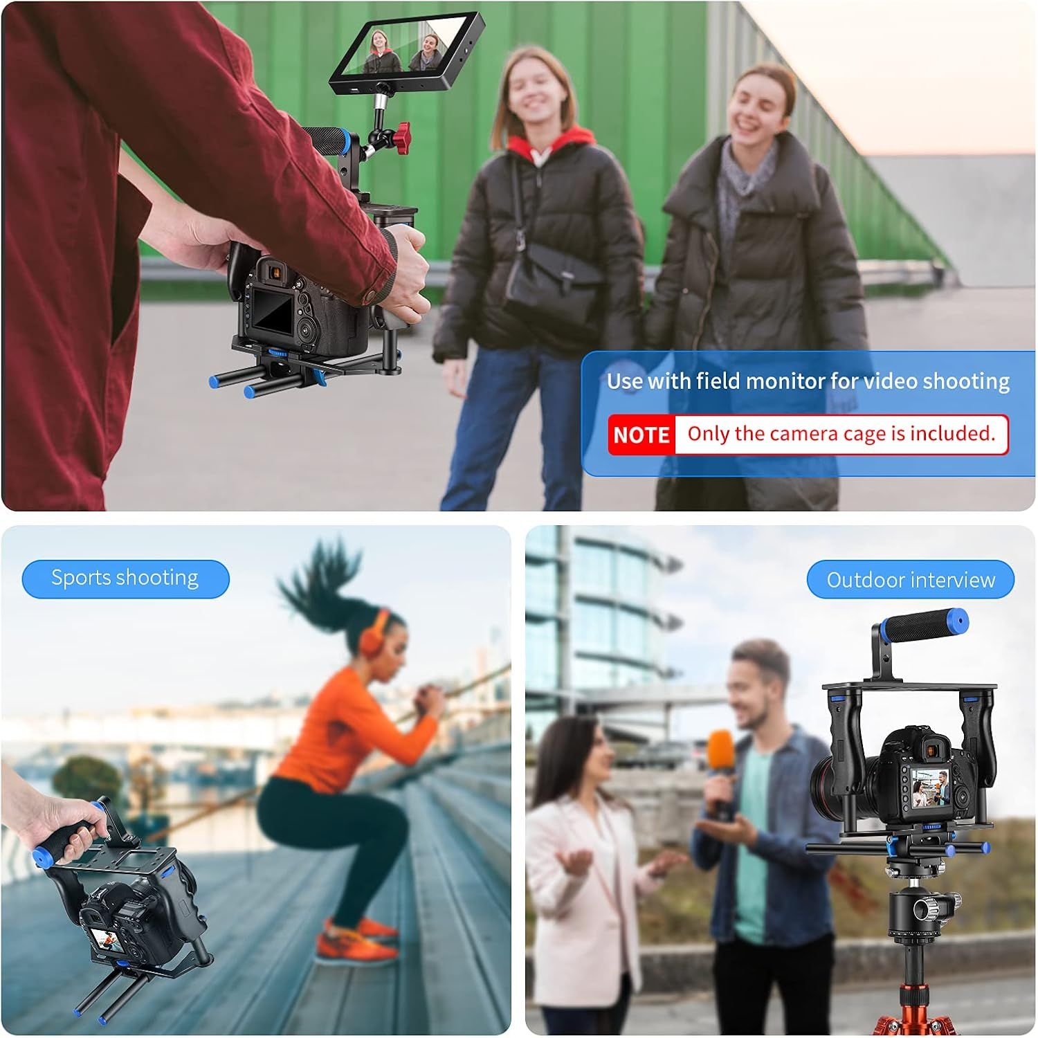 - NEEWER Camera Video Cage Film Movie Making Kit, Aluminum Alloy with Top Handle, Dual Hand Grip, Two 15mm Rods, Compatible with Canon Sony Fujifilm Nikon DSLR Camera and Camcorder (Black + Blue)