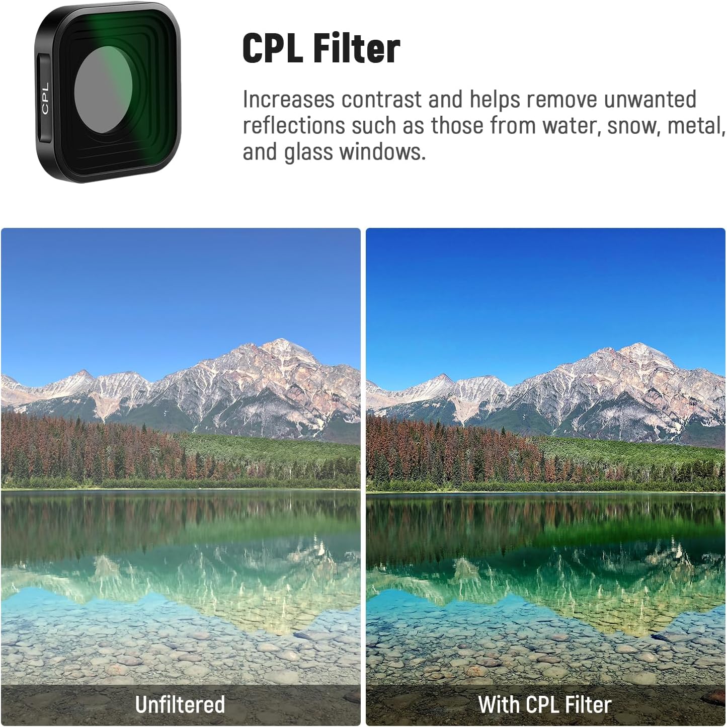 - 【Reduce Lens Flare】Neutral density filters reduce light to decrease the chance of overexposure. Polarizer filter increases contrast while eliminating reflection and glare. The CPL Filter is at a preset level and can prevent unnecessary glare from reflecting surfaces (such as water, snow and even glass windows) without rotation.