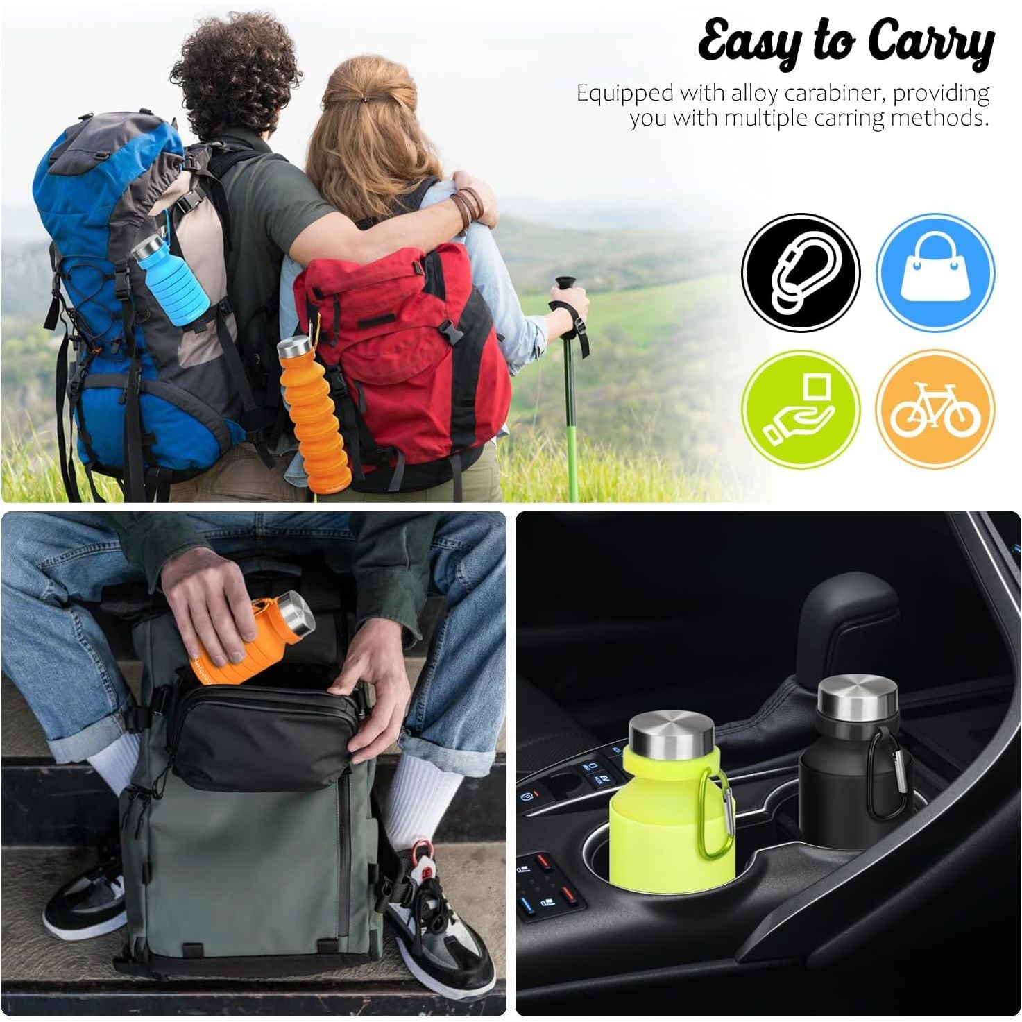 - Portable Design: Collapsible and durable silicone water bottle with carabiner for easy transport.