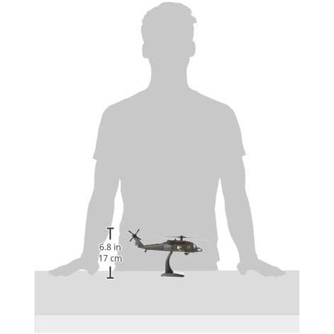 The model from UH-60 Black Hawk measures abut 9.5 inches in length. It is mostly made of metal. The plastic parts would be the wings, weapons and rotor blades. Both rotors can spin freely. The details are nice; the panels along the fuselage are very well defined and accurate. The wheels on the main landing gear can spin freely [so don't let it roll off a table]. Both side doors can slide open and close. If you look carefully through the door's window or open the doors, you will see that there are seats and stations inside where the troops/crew would seat. A display stand is included where the model can be mounted. Printed on the display's base is info about the model, such as scale and official name of the particular model. This model comes with plastic accessories which includes one plastic fighting vehicle and 4 soldier figures. The box measures 16 inches long by 5 inches high by 6 inches deep.