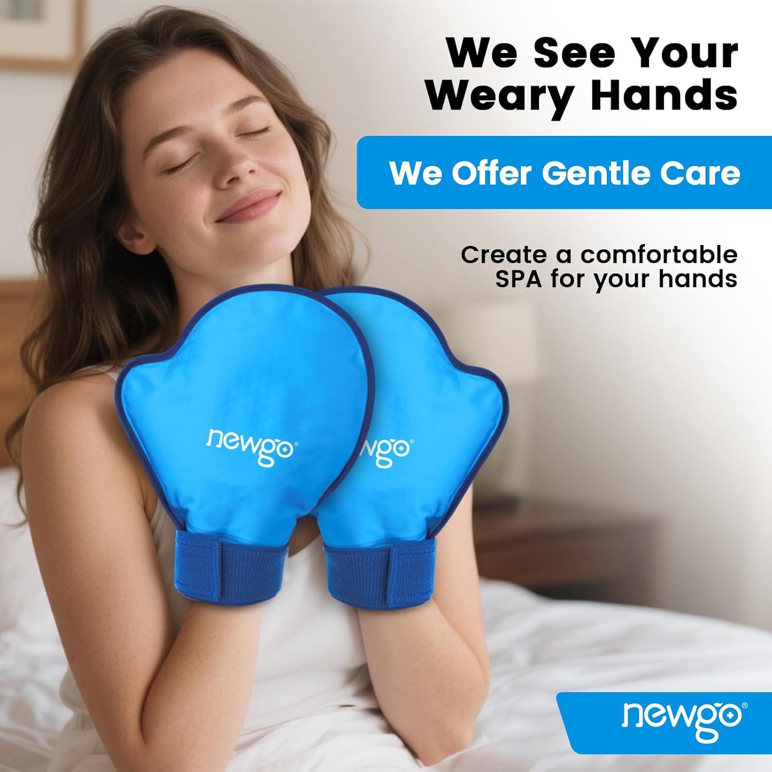 - Fast Pain Relief For Aching Hands - Include 2 gel ice gloves. NEWGO ice pack gloves can fully cover the hands and help to effectively relieve hands & fingers pain, carpal tunnel soreness, sprained wrist strain injury, neuropathy during chemotherapy, inflammation, teninitis, soreness, itching hands and eczema rash to stop itching.