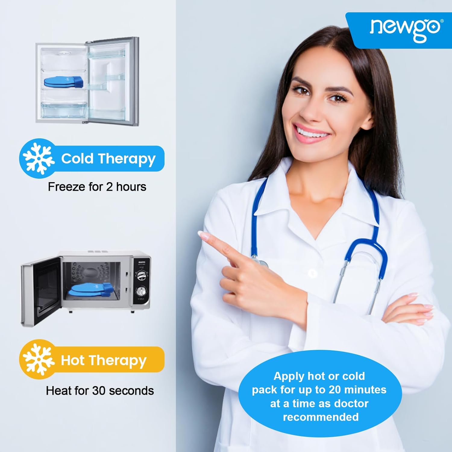 - Hot Cold Therapy - The gel ice pack filled with low freezing point gel, stays flexible even after freezing at 0°F (-18°C).Place ice pack in complimentary storage bag to freeze at least 2 hours for cold therapy or microwave ice pack for 30 seconds for hot therapy. Appy hot or cold to affected area for no more than 20 minutes at a time.