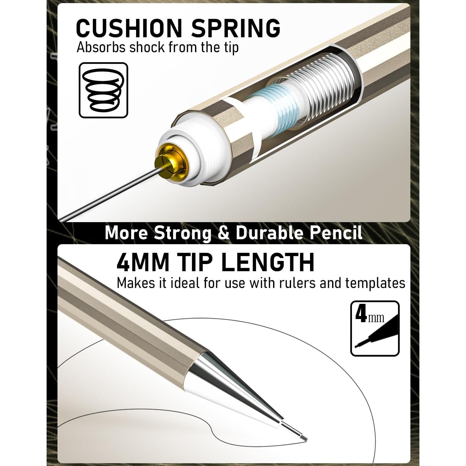 - 4 PCS Mechanical Pencils : 4 mm tip length makes it ideal for use with rulers and templates, various line size (0.3 mm,0.5 mm,0.7 mm & 0.9 mm) satisfy your demand. Polygon shape of these mechanical writing pencils avoids sliding on drawing tables. In addition, the pencil is pre-loaded with a 90mm-lead.