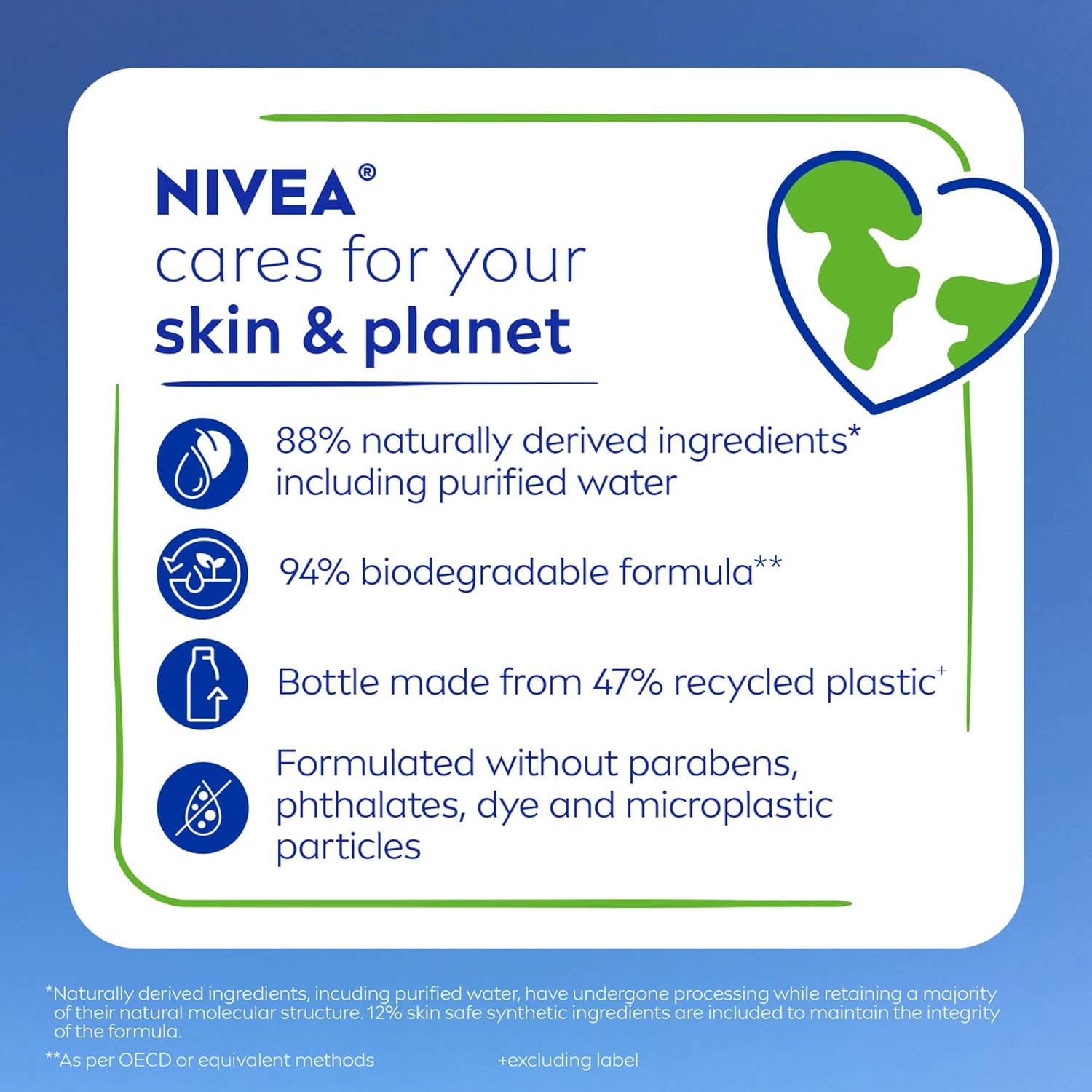 NIVEA Nourishing Care Body Wash provides nourishing moisture for soft, smooth and healthy-looking skin. This moisturizing body wash for dry skin is enriched with a unique blend of naturally-derived* oils, Provitamin B5 and Vitamin E. It gently cleanses and gives you a fresh and hydrated skin feeling. This soft floral-scented body wash delivers long-lasting moisture that leaves skin feeling soft and smooth all day. Ideal for everyday use, this hydrating body wash can also be used as an alternative to shaving cream. Plus, this moisturizing body wash is microbiome gentle and free from parabens, phthalates and microplastic particles. This women's body wash uses 88% naturally derived ingredients* has a 94% biodegradable formula**, and is packaged in a bottle made from 50% recycled plastic***, reflecting NIVEA's commitment to sustainability. For skin that feels completely nourished, pair this body wash with NIVEA Essentially Enriched Body Lotion. *Naturally derived ingredients, including purified water, have undergone processing while retaining a majority of their natural molecular structure. 12% skin safe synthetics are included to maintain the integrity of the formula. **as per OECD or equivalent methods ***excluding label