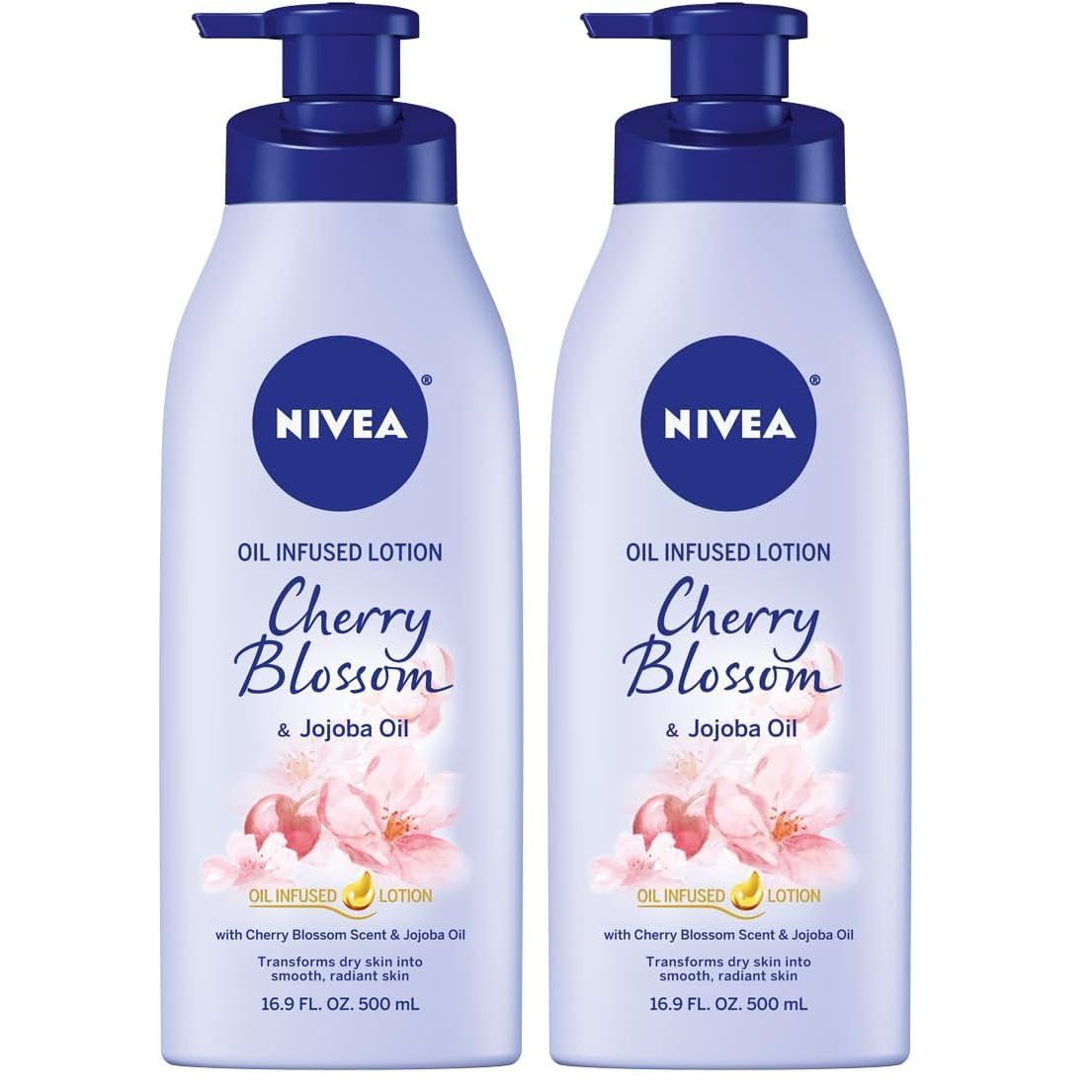 - NIVEA Oil Infused Cherry Blossom and Jojoba Oil Body Lotion for Women, Fast-Absorbing and Non-Greasy Cherry Blossom Scented Lotion Moisturizes for 48 Hours, 16.9 Fl Oz Pump Bottle