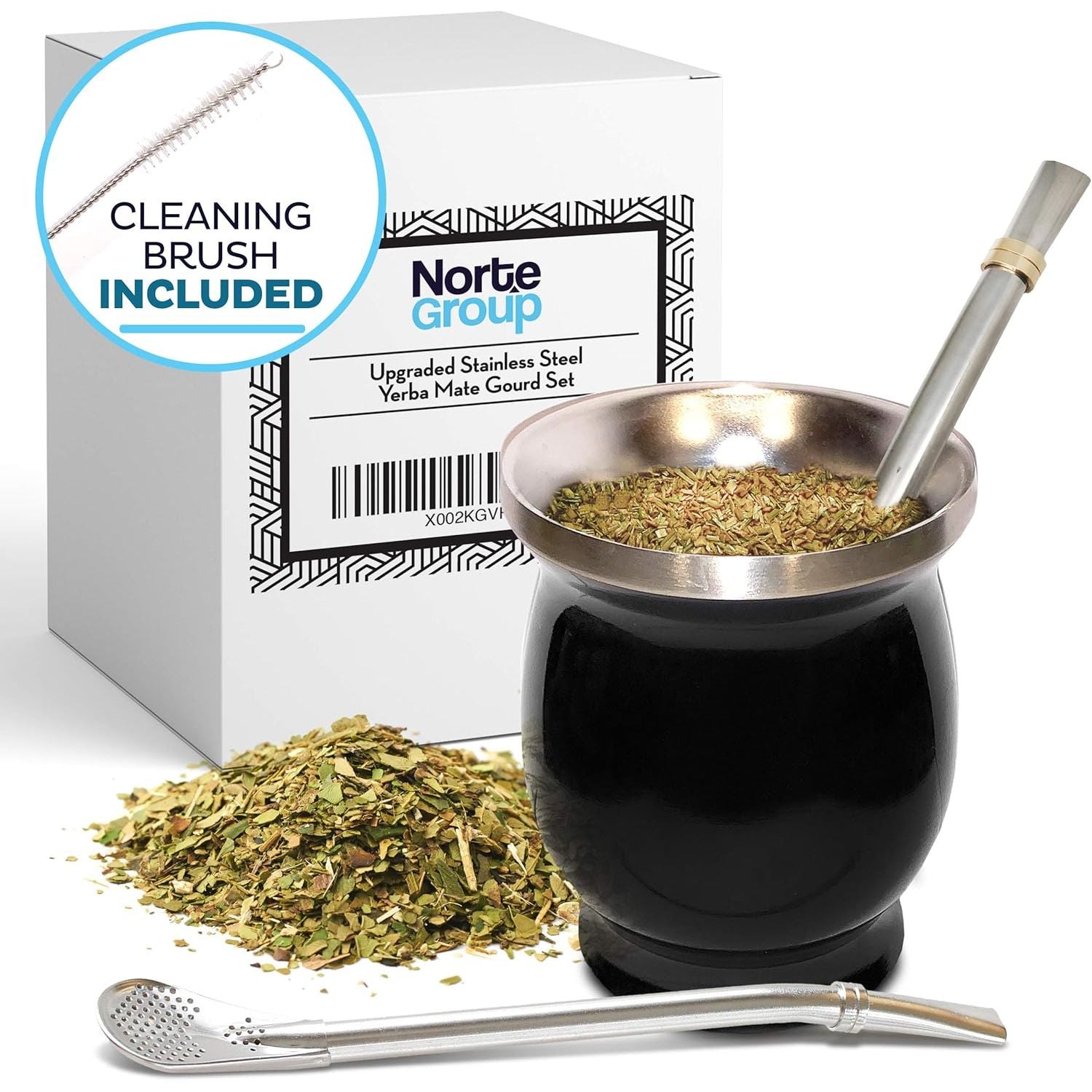Norte Yerba Mate Cup Kit, 8-Ounces Traditional Mate Tea Cup/Gourd Set | Includes 2 Bombillas (Yerba Mate Straw) & Cleaning Brush, Stainless Steel Cup, Double-Walled, Easy to Clean | Black