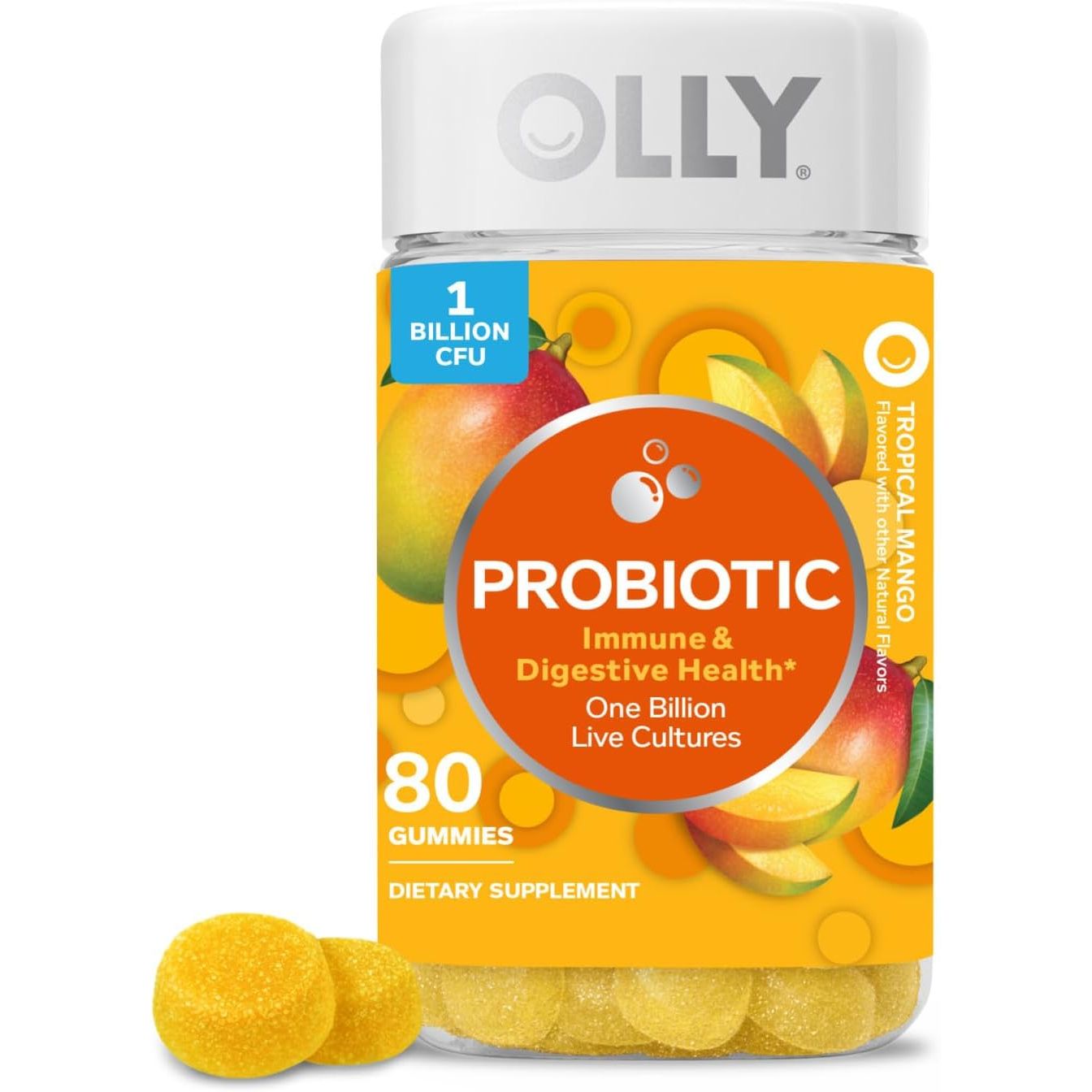 - OLLY Probiotic Gummy, Immune and Digestive Support, 1 Billion CFUs, Chewable Probiotic Supplement, Mango, 25 Day Supply - 50 Count