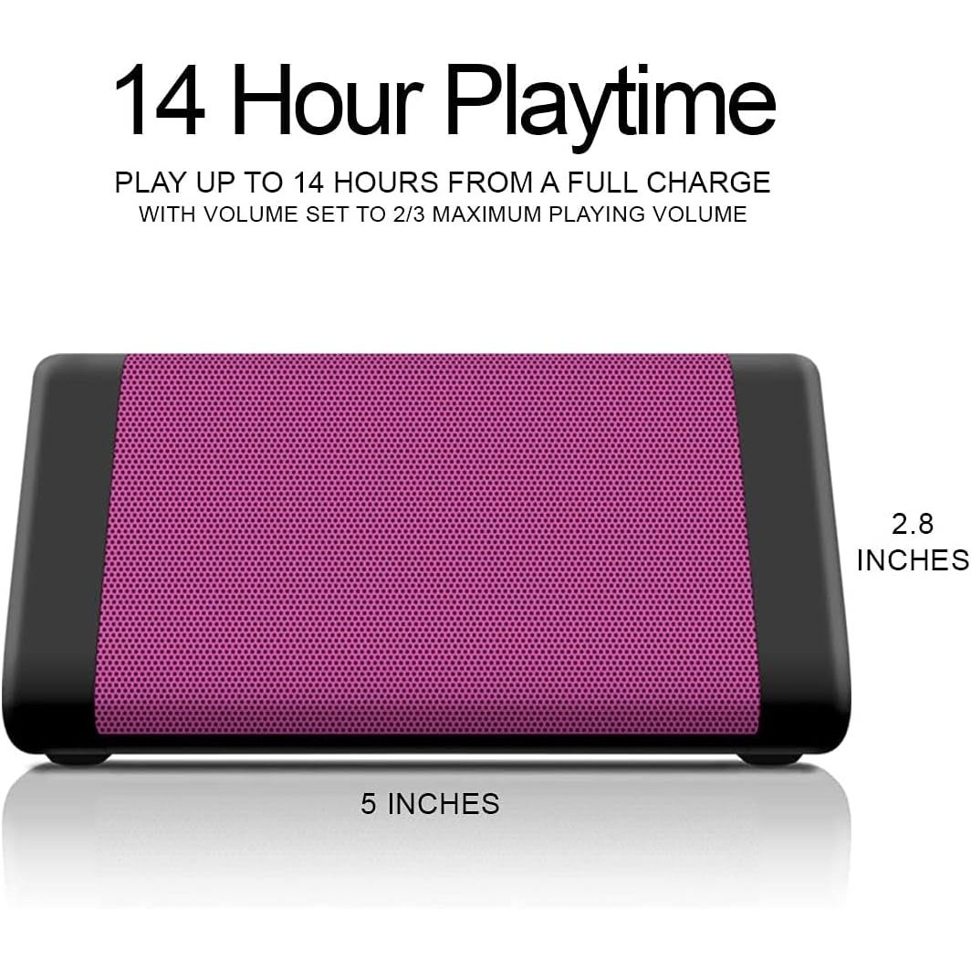 - PRODUCT DETAILS - Dimensions: (L) 5.3” x (W) 2.8” x (H) 2.6”. Output Voltage: 10 Watts. Blue Tooth Speaker Range: 100ft. Color: Pink.