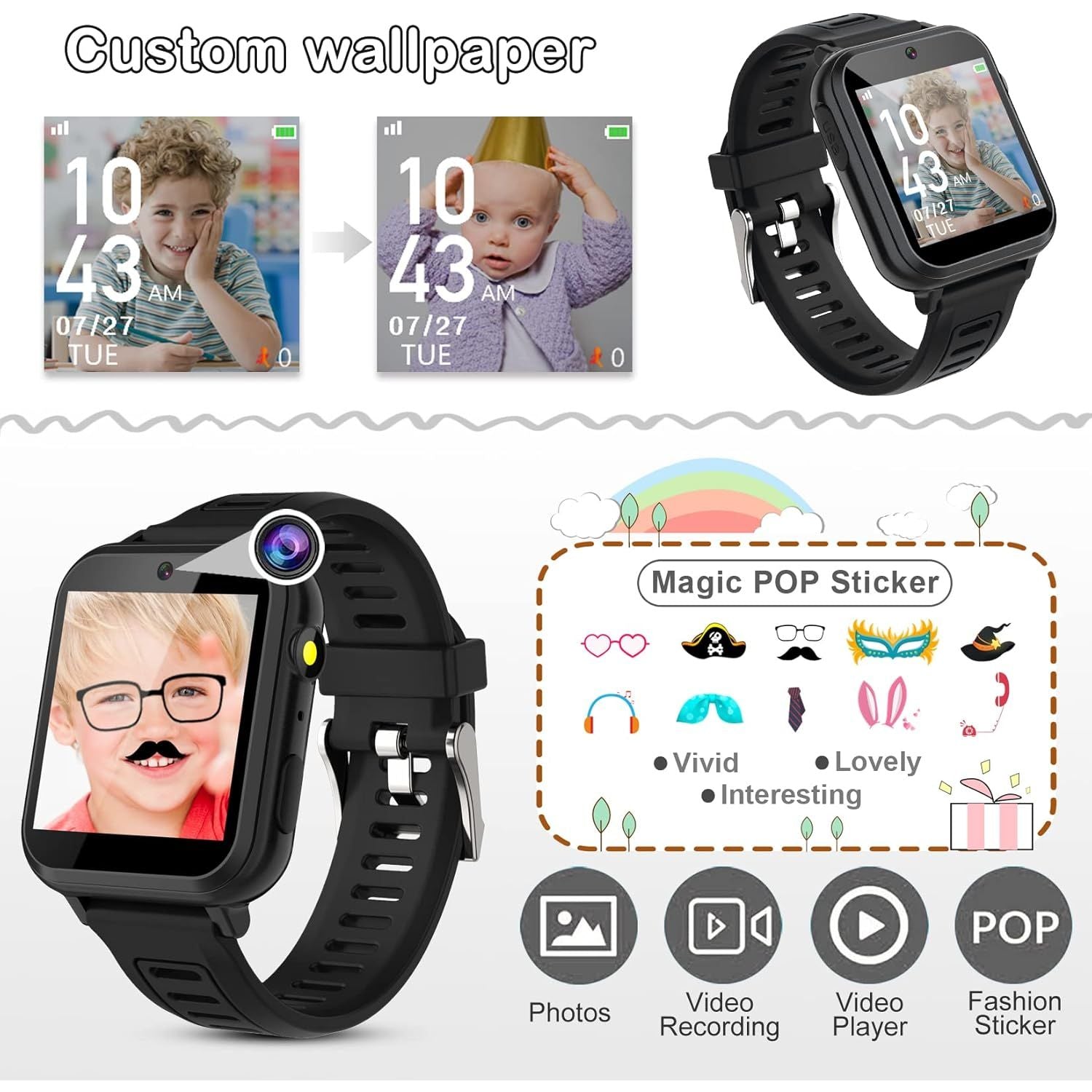 - 👍⌚【Fun Selfie-Cam & Video】Kids touchscreen smart watch supports such as camera and video perfectly. Children usually use "VCRS + magic cameras" to record every happy moment in their lives. Set your favorite photo as wallpapers. Kids watch is capable of store 10000+ HD photos or 6+ hours video.