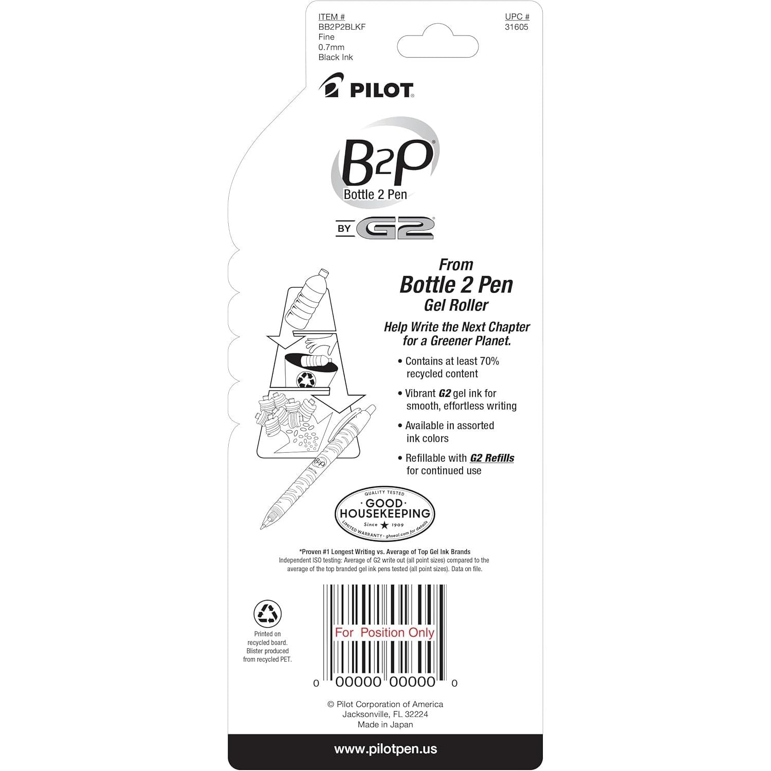 Product Description With the B2P, from Bottle 2 Pen Gel Roller, Pilot has launched the world's first pen made from recycled bottles! In recent years, plastic water bottles have been under close scrutiny for their environmentally unfriendly characteristics. Almost every hour, close to 250,000 plastic bottles enter landfills and comprise close to 50 percent of all recyclable waste. Made from 89 percent post-consumer recycled plastic bottles, the Pilot B2P features vibrant gel ink and a fine 0.7mm point for smooth, effortless writing. Designed to mimic a bottle of water, the body of the B2P pen is translucent blue with unique striations like those commonly found on water bottles. Retractable and refillable, the B2P uses the same ink refill as the Pilot G2, America's number one selling gel pen. Available in blue, black, and red ink, the writing quality of the B2P meets the same high performance standards found in all of Pilot Pen's products. Pilot Pens. Simply write. From the Manufacturer B2P BeGreen Gel Pen is made from recycled plastic bottles and contains a high percentage of recycled material. Vibrant gel ink delivers smooth, effortless writing. Gel pen has a retractable fine point and is refillable for continued use with G2 refills. Gel pen also earned the prestigious Good Housekeeping Seal.