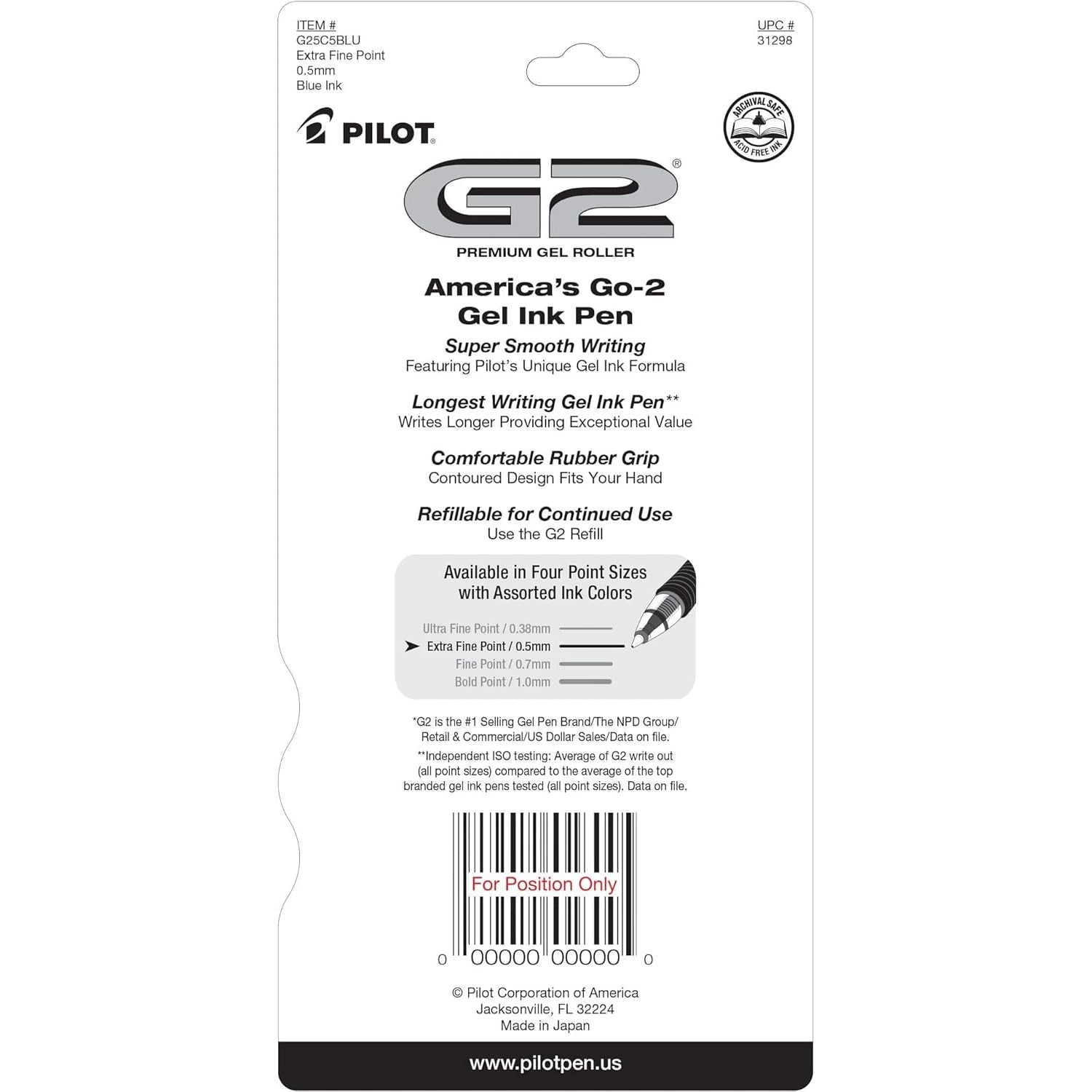 - Pilot, G2 Premium Gel Roller Pens, Extra Fine Point 0.5 mm, Pack of 5, Blue