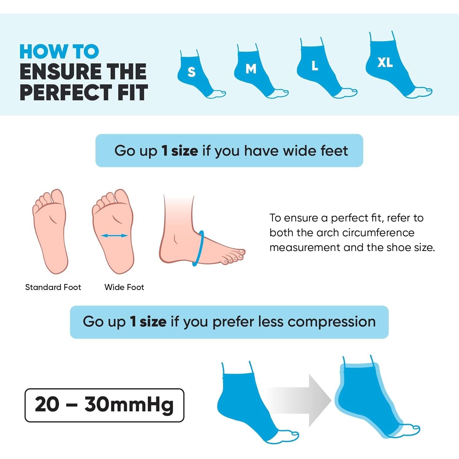 - Please make sure to measure yourself according to our sizing chart to ensure that you get the best fit for you! Get ready for a peaceful night’s sleep and relief from morning pain! The fabric is thin and stretchy, with unbeatable compression of 20-30mmHg, holding both your feet at the correct angle and compressing them equally.