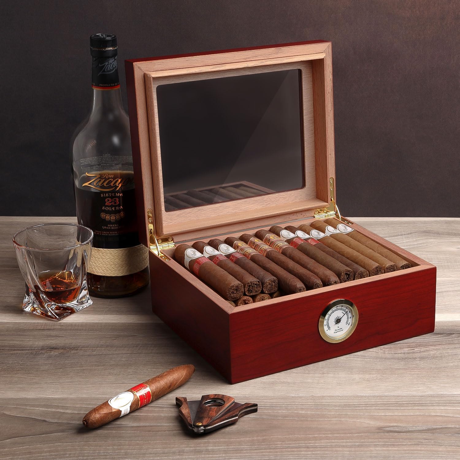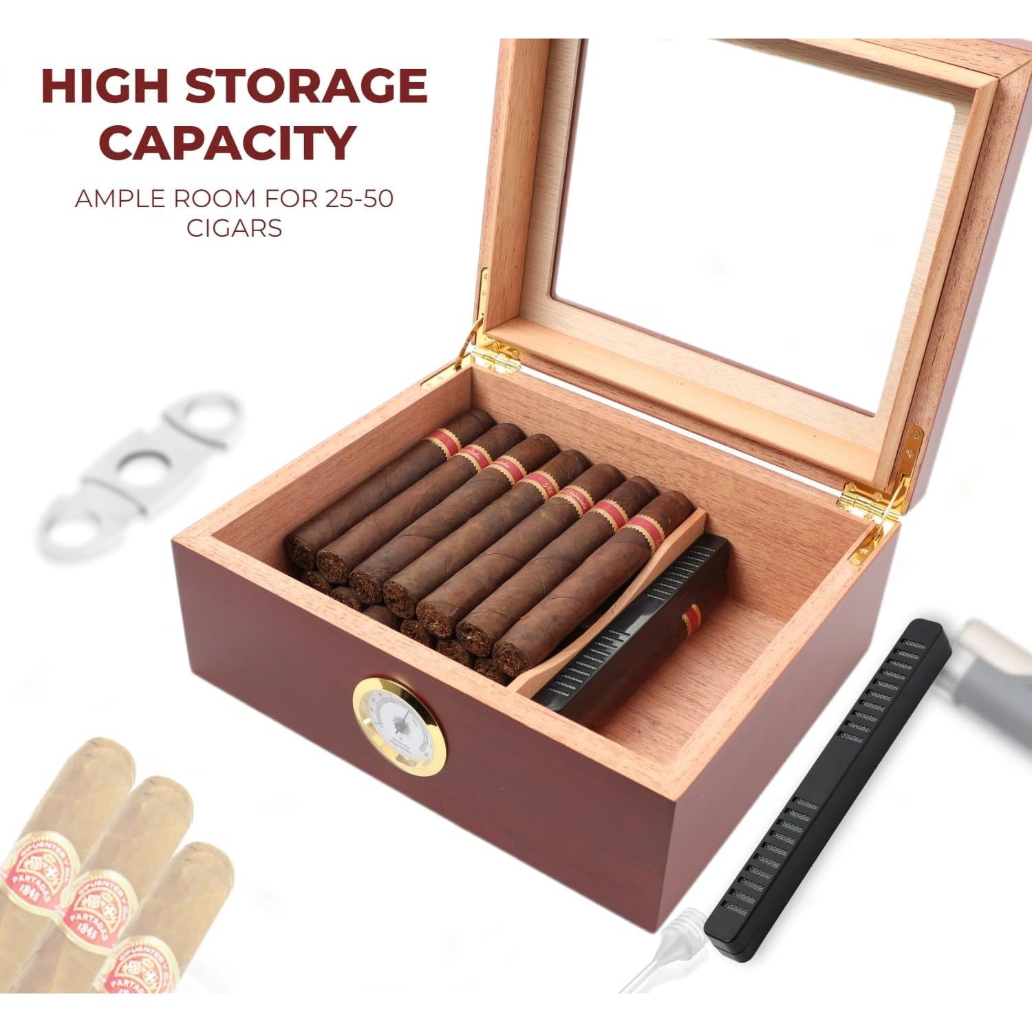 • This humidor comes with a humidifier, hygrometer, and a movable divider to organize your cigars.