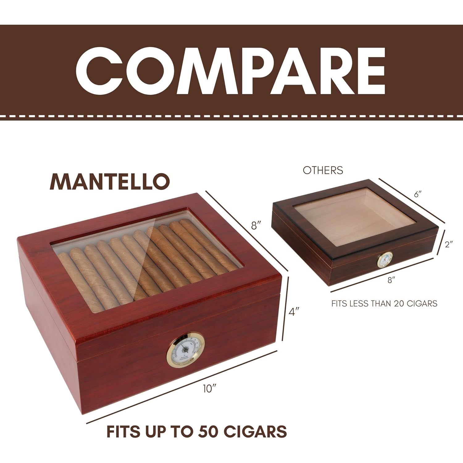 Enhance your cigar experience with the Mantello Deluxe Glass Top Cigar Humidor, a stunning piece designed for the discerning cigar connoisseur. Crafted with precision and care, this humidor combines elegance and functionality to keep your cigars in pristine condition. Activate your new humidor's cigar box humidifier with pure distilled water. This simple step ensures the humidity stabilizes at the ideal humidity level, safeguarding your cigars' integrity. Perform the "dollar bill test" with your humidor. The "dollar bill test" for cigar humidors involves closing the lid on a dollar bill; if you can easily pull it out without resistance, the humidor may have an imperfect seal, potentially affecting its ability to maintain proper humidity levels. How many cigars fit in the humidor? Between 25 and 50 cigars depending on the ring gauge. What is included with the humidor? Included is the humidor cigar box, humidifier bar, and divider. Does this humidor hold humidity? The Mantello humidor is constructed for enhanced humidity control. It seals tightly and makes sure humidity levels stay steady. Since 2012, Mantello has been providing quality goods to our customers across the USA. We have come to earn the trust of our customers and have made a name for ourselves as a top seller on Amazon and beyond. We strive to provide you with the essentials you need and the quality you deserve. It’s the basics – but better. We started out small, selling cigar humidors and accessories but have since expanded with our home and lifestyle essentials brands! We are still a small team but now we are a recognized and trusted brand- based right here in the USA! Thinking up, designing and testing new products is our passion, and we love it! Starting from the seed of an idea for a new product until it gets launched it on Amazon, our goal is to create something that you will use and love. And your feedback is what makes it all worth it!