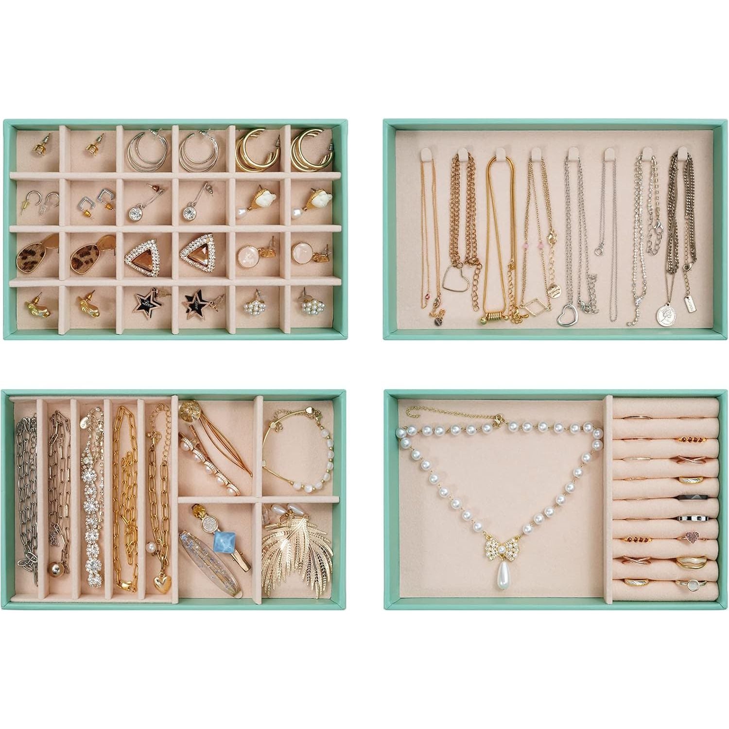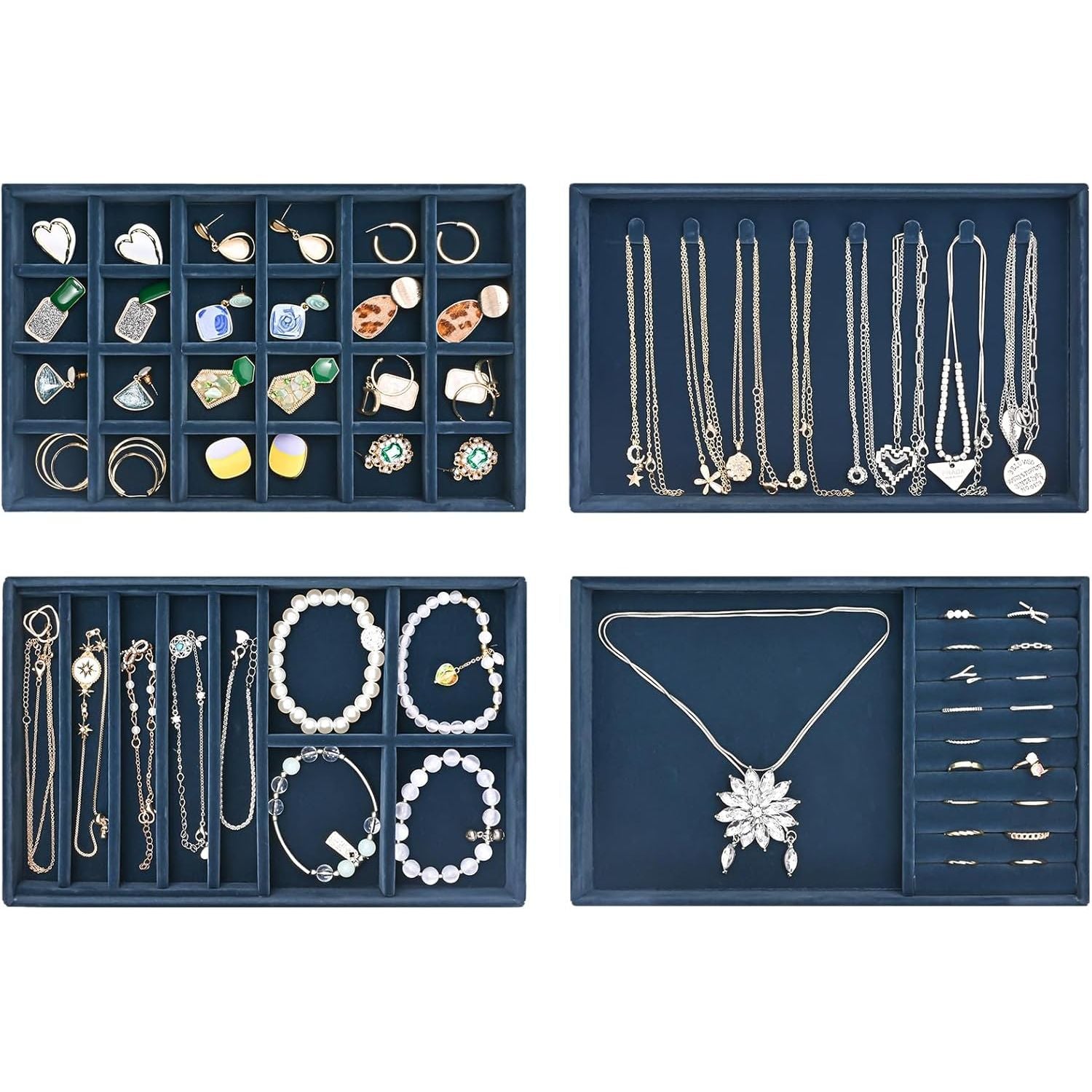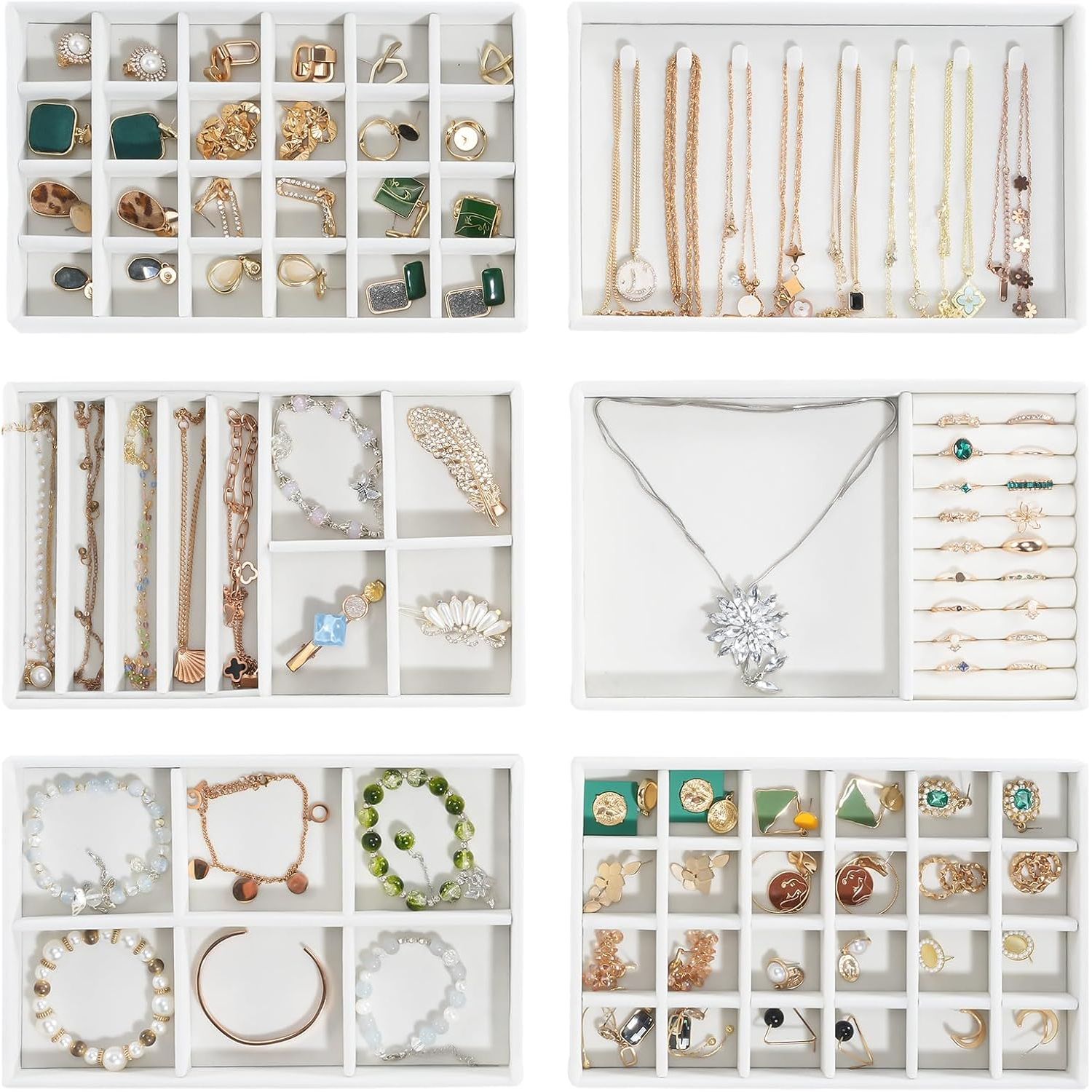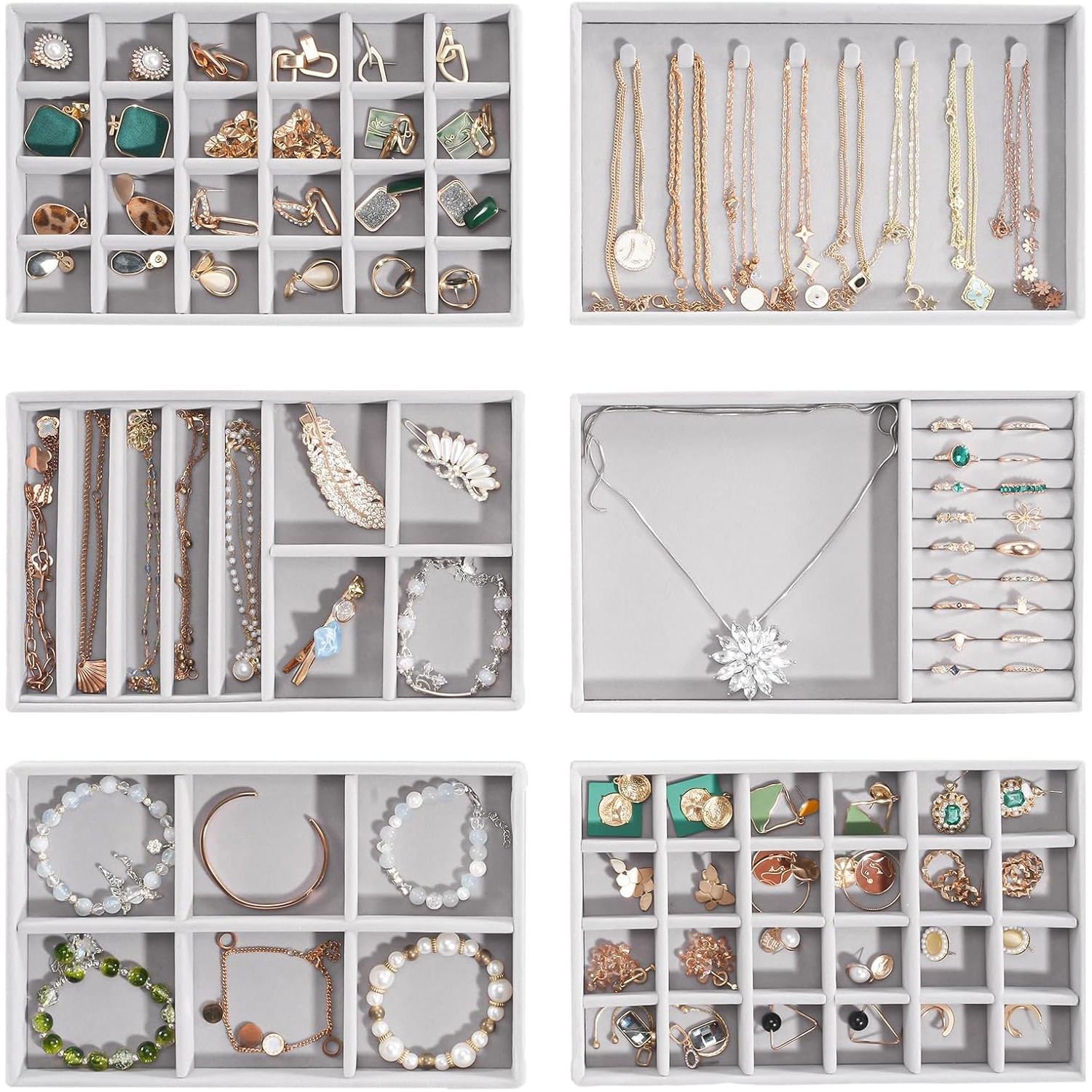 • Each tray: 9.4 x 5.9 x 1.1 inches; These jewelry tray organizers with right sizes will sit perfectly in your dresser drawer, protecting your jewelry from scratches and other damage