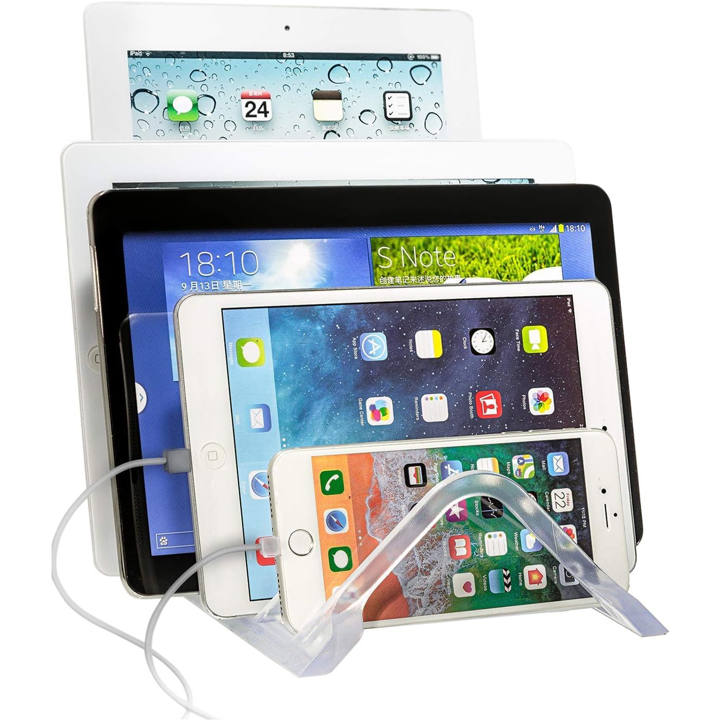 • Hold and Dock 5 Devices: This compact multi tablet and phone stand organizes up to five smartphones, tablets, or power banks, keeping them upright and accessible on desks or countertops