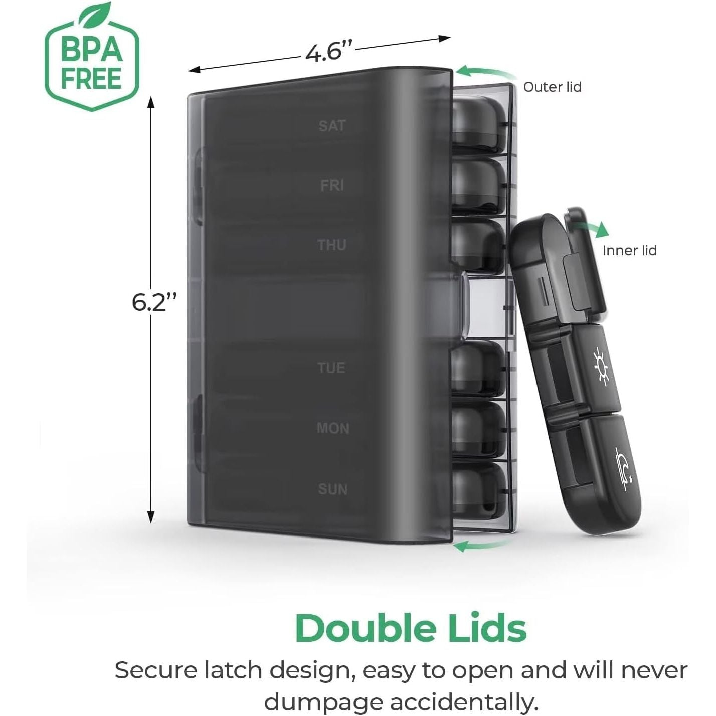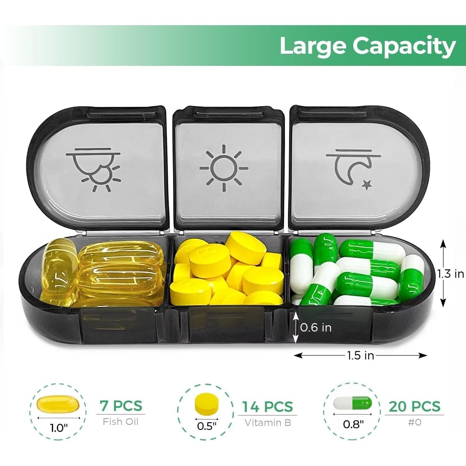 - Track Your Medication: Pill container (morning, noon and night) sort your pills 3 times a day; larger black shell can accommodate 7 independent pill box organizer to plan the pills for a week. Separate pill holder, this pill dispenser has 7 movable vitamin organizers, which can be taken out separately every day for your on the go use.