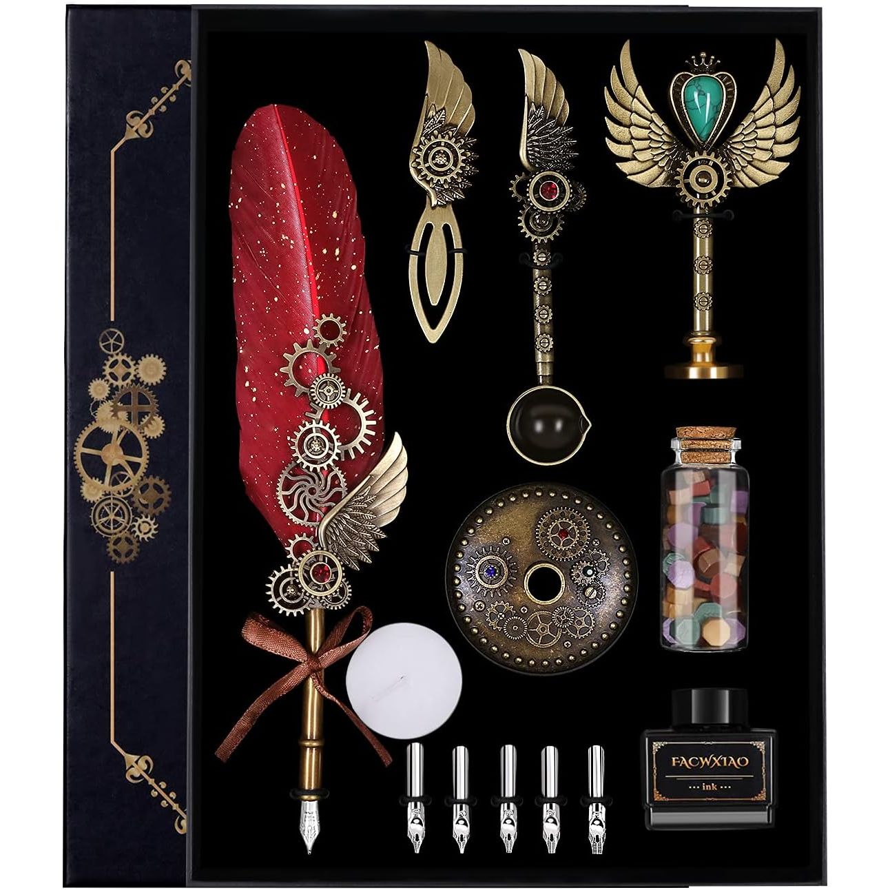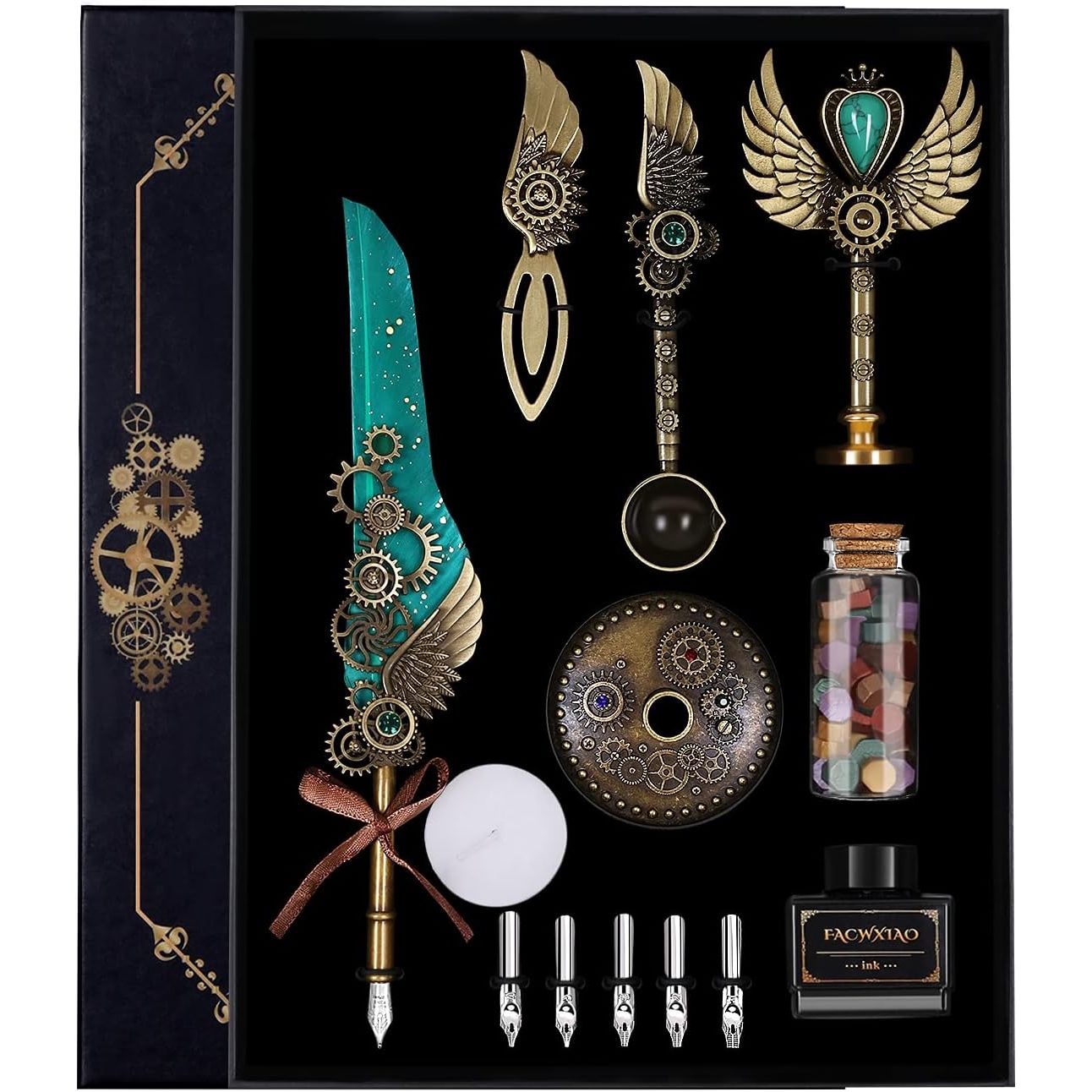 - Quill Pen Set, Green, Feather Pen, Ink, Bookmarks, Seals, Nibs, Wax Bead, Envelopes, Writing Paper, Gift Box