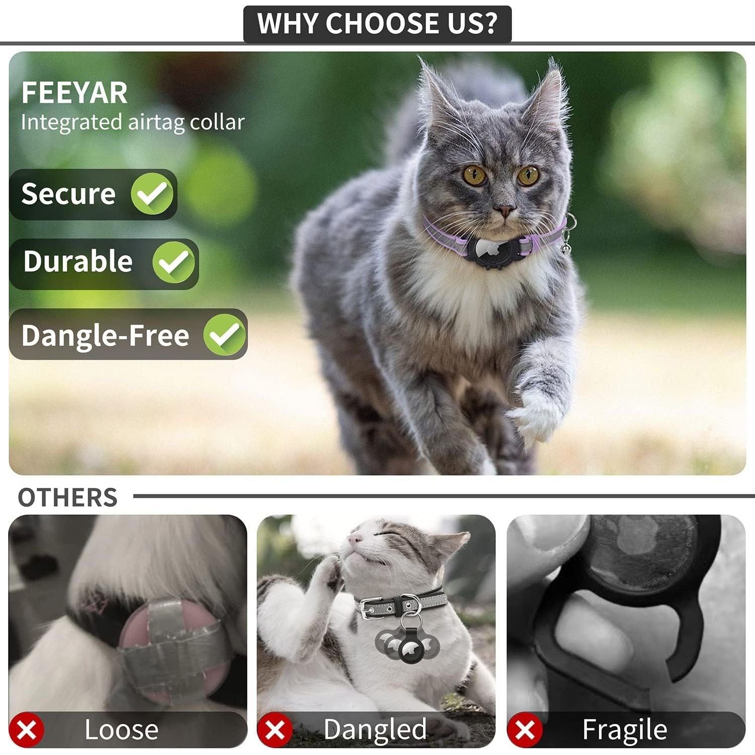 - [DESIGNED FOR AIRTAG] Unlike other separated AirTag cases, FEEYAR integrated Air Tag cat collar fits the Apple AirTag perfectly, protect your AirTag device and prevent AirTags from falling off or dangling. It allows you to easily find the location of your pet.(Note: AirTag is not included.)