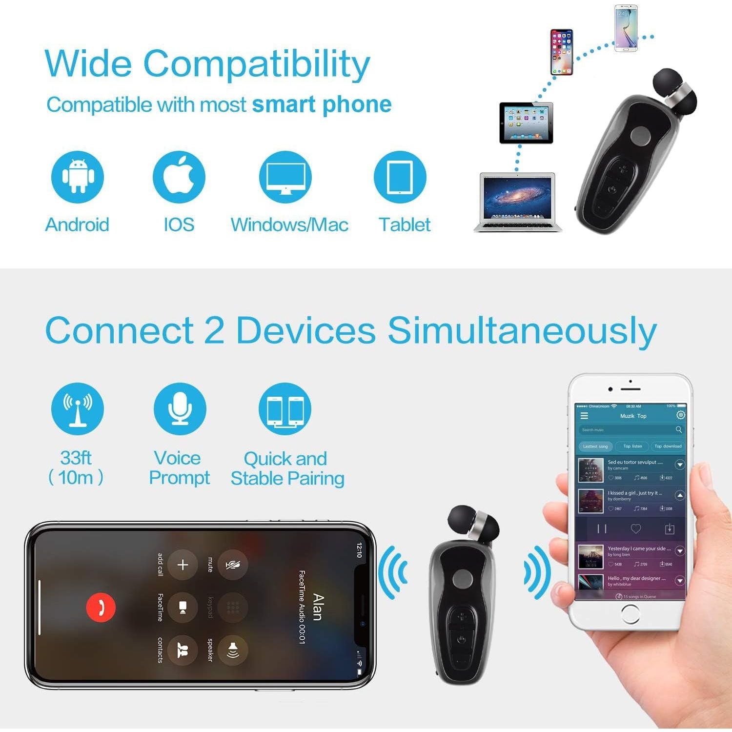 - Multi Applycations : Single in ear retractable wireless headset provide the clear counds. Comfortable wearing , good for car drivers , business men. Compatible well for most of device as smart phones, tablet, Pad, PC…