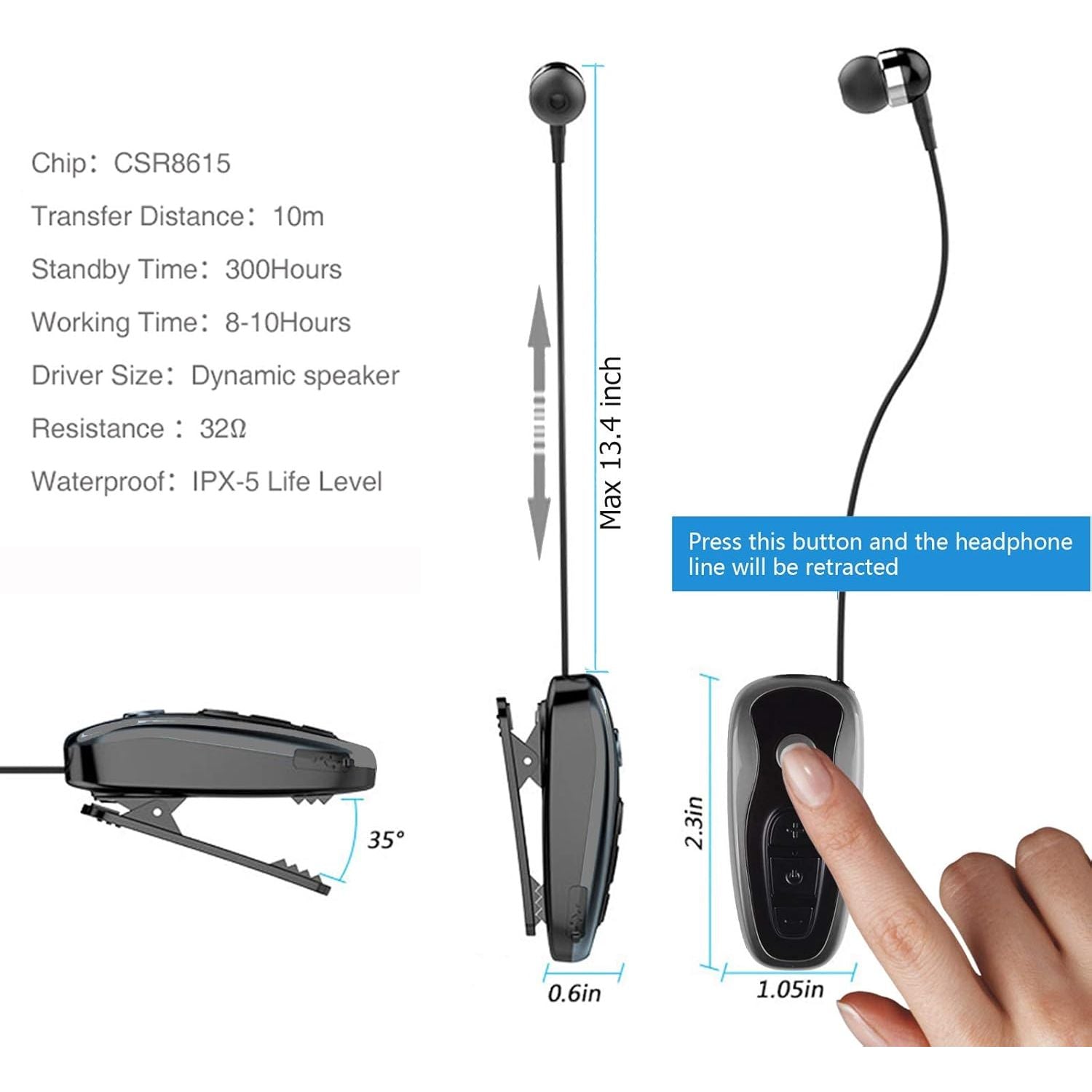 - Clip on Retractable Wireless Earbud : Collar clip and flexible pulling design is no kinking and no broken which is in order. It's convenient to clip under your collar and easy to carry.