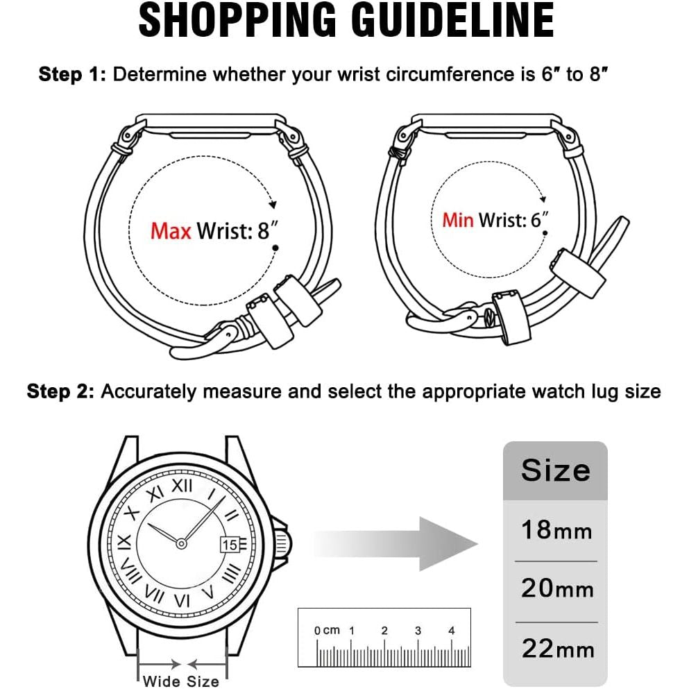 At Ritche, we create high-quality, stylish watch bands that last. We noticed a gap in the market for bands that were functional and fashionable, so we started with a small team of watch enthusiasts. Today, we're one of the leading brands in the industry. We believe every watch deserves the perfect band, so we've made it our mission to create watch bands for every style and occasion, from classic leather to modern metal, including genuine leather, stainless steel, and silicone, and fit a wide range of watch models Solution 1: Check the underside of your current watch band to see if the width is marked. Solution 2: Measure your watch lug width where the band attaches to the watch head, just as the picture showing. Solution 3: Search online for the specs of your watch make/model. A. 18mm/20mm/22mm is the watch lug width, please check it clearly before ordering. B. About the watch strap length,we guarantee to fit most wrists. Designed to fit wrists 6" to 7.5". ▲Please measure your watch lug width before placing order. If you are not sure, please feel free to contact us anytime. - LG Watch Style - Withings Activite - Huawei Watch 1st Gen - ASUS Zenwatch 2 1.45" (small version) - Withings Steel HR 36mm - Withings Sapphire - Venture, Scarlette; - LG Watch Style; ▲ Also fit nearly all other watches with a 18mm lug width - Ticwatch 2 - Samsung Gear S2 Classic (SM-R732/R735) - Fossil Q Gazer - Samsung Gear Sport (not fit Samsung Gear S2) - Samsung Galaxy Watch (42mm) - Samsung Galaxy Watch Active (40mm) - Nokia Withings Steel HR 40mm - Pebble Time Round Large ▲Also fit nearly all other watches with a 20mm lug width - Seiko SKX007 - Pebble Time / Pebble Time Steel / Pebble Classic - Huawei Watch 2 Classic - Samsung Gear S3 Frontier and Classic - LG G Watch W100/ LG G Watch R W110/ LG Watch Urbane W150 - Zenwatch (1st Generation) - Fossil Q (1st Gen)/ Fossil Q Founder 2.0 /Grant /Wander /Crewmaster Hybrid ▲ Also fit nearly all other watches with a 22mm lug width